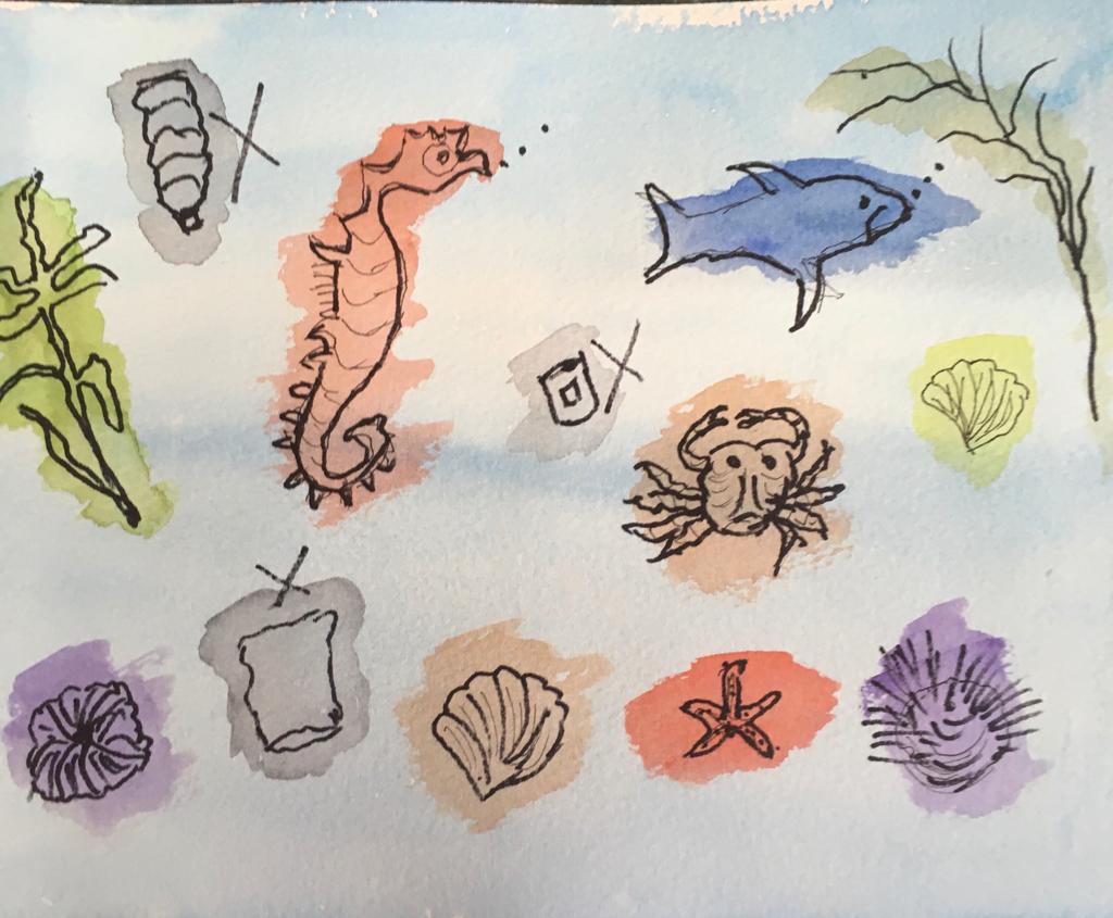 Using a black fine liner pen, or even pen and ink draw into your shapes to bring them to life. The beauty is that less is more, use the contrast of the paint and ink to act like a simple print . Very simple, but very effective. And who knows what lurks inside the paint waiting to come to life?!!