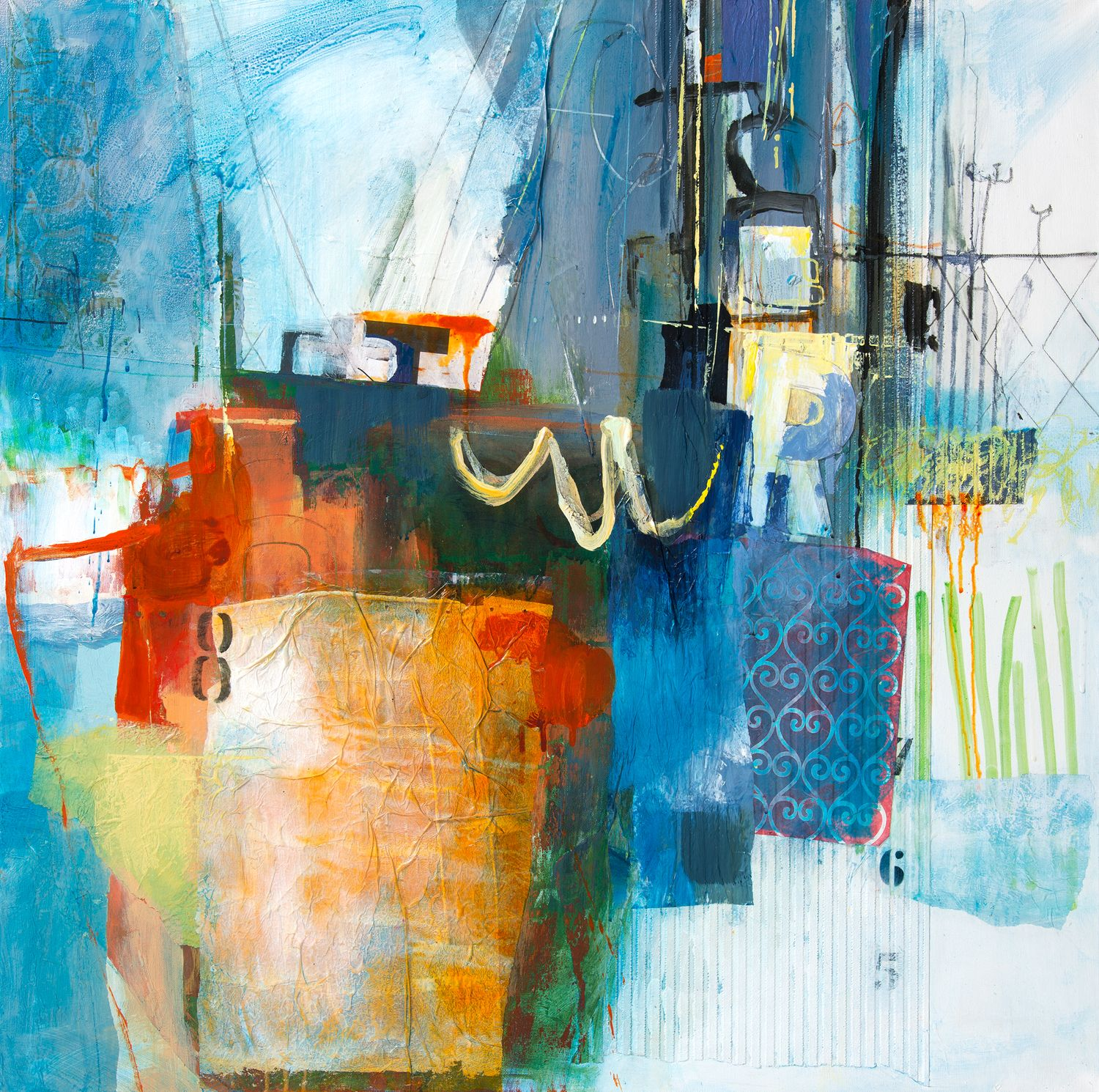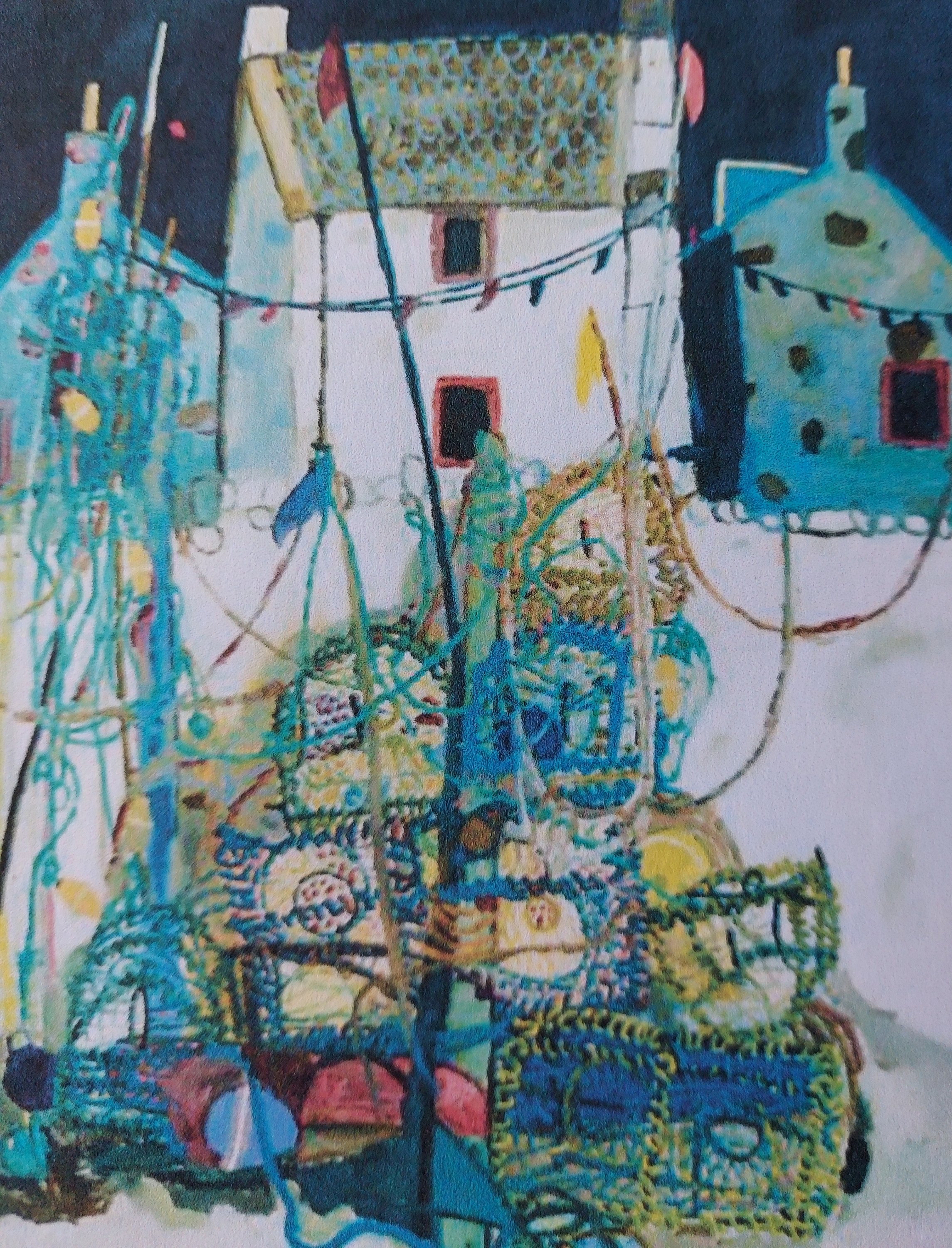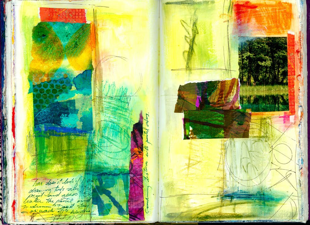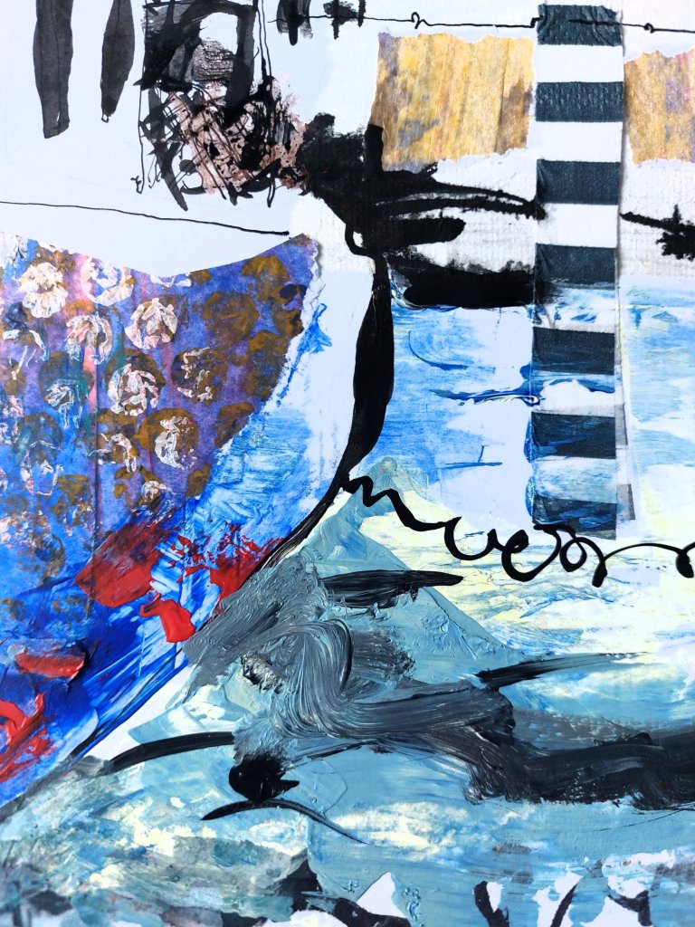 Card line prints/loopy line in ink/stencil line ink/pastel. Line is crucial to bring an image together. These techniques give structure and fluidity.