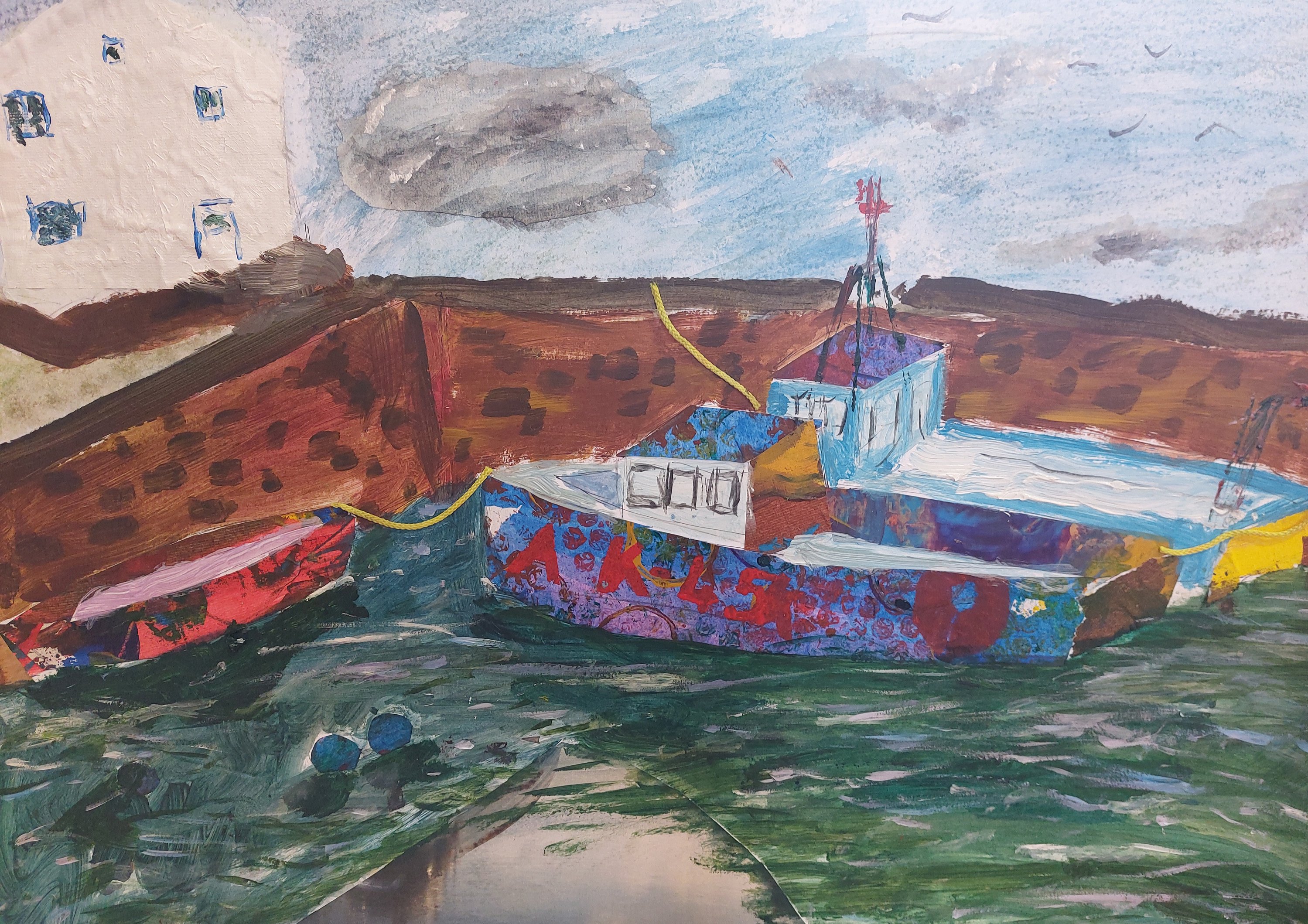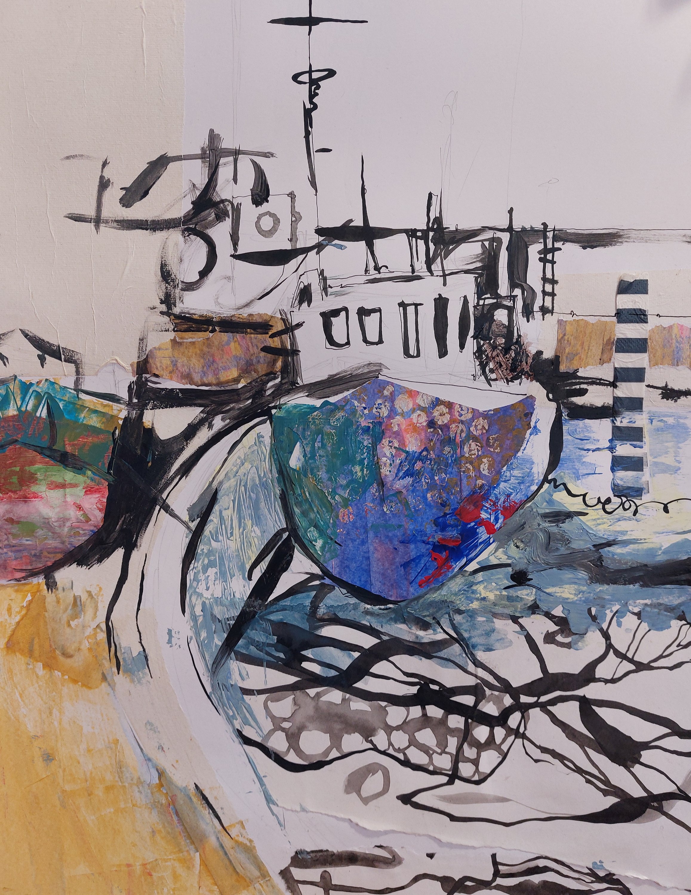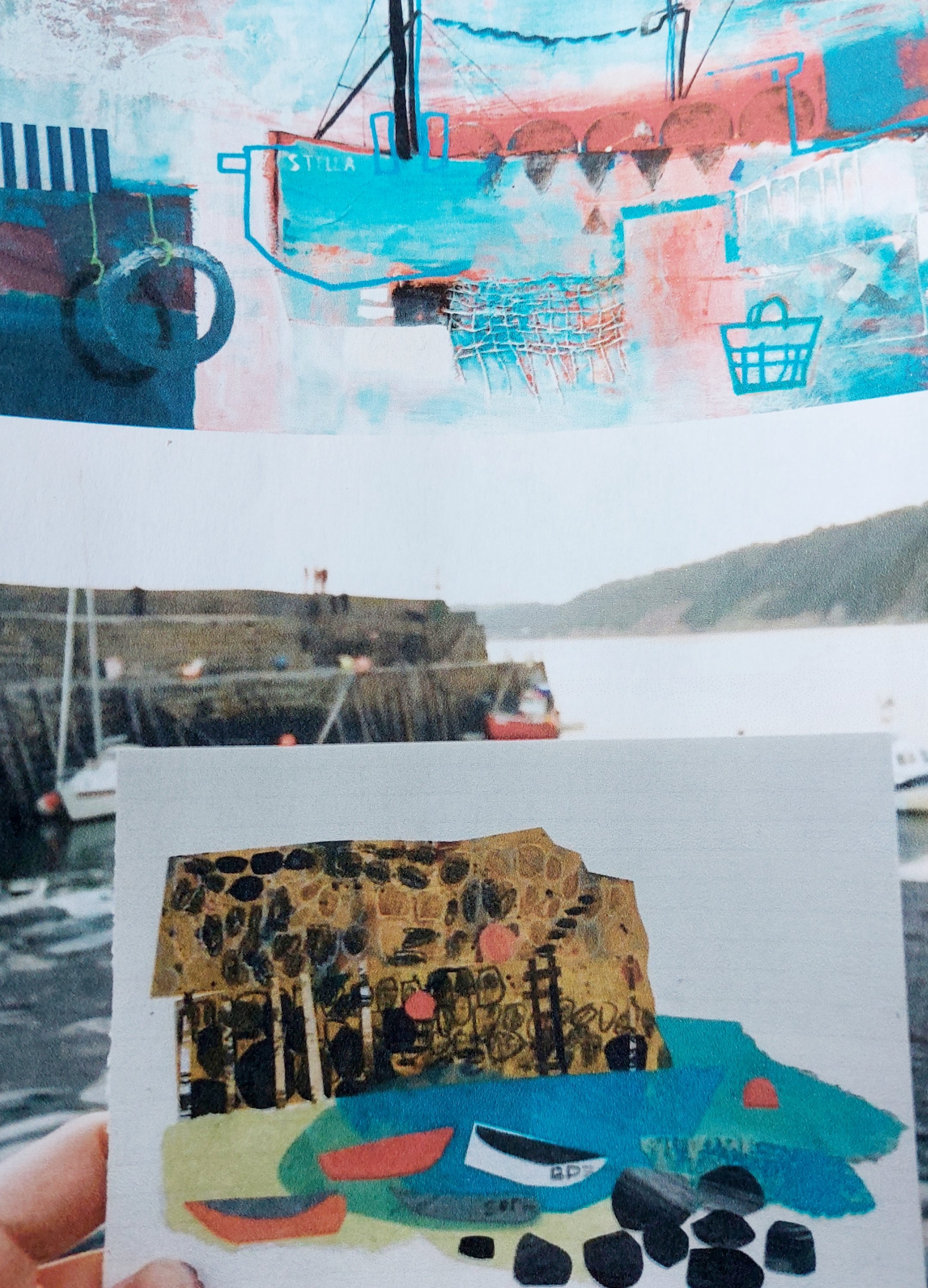 This workshop focused around creating a Harbour collage from scraps of pre painted papers and using ink and line to draw on details.