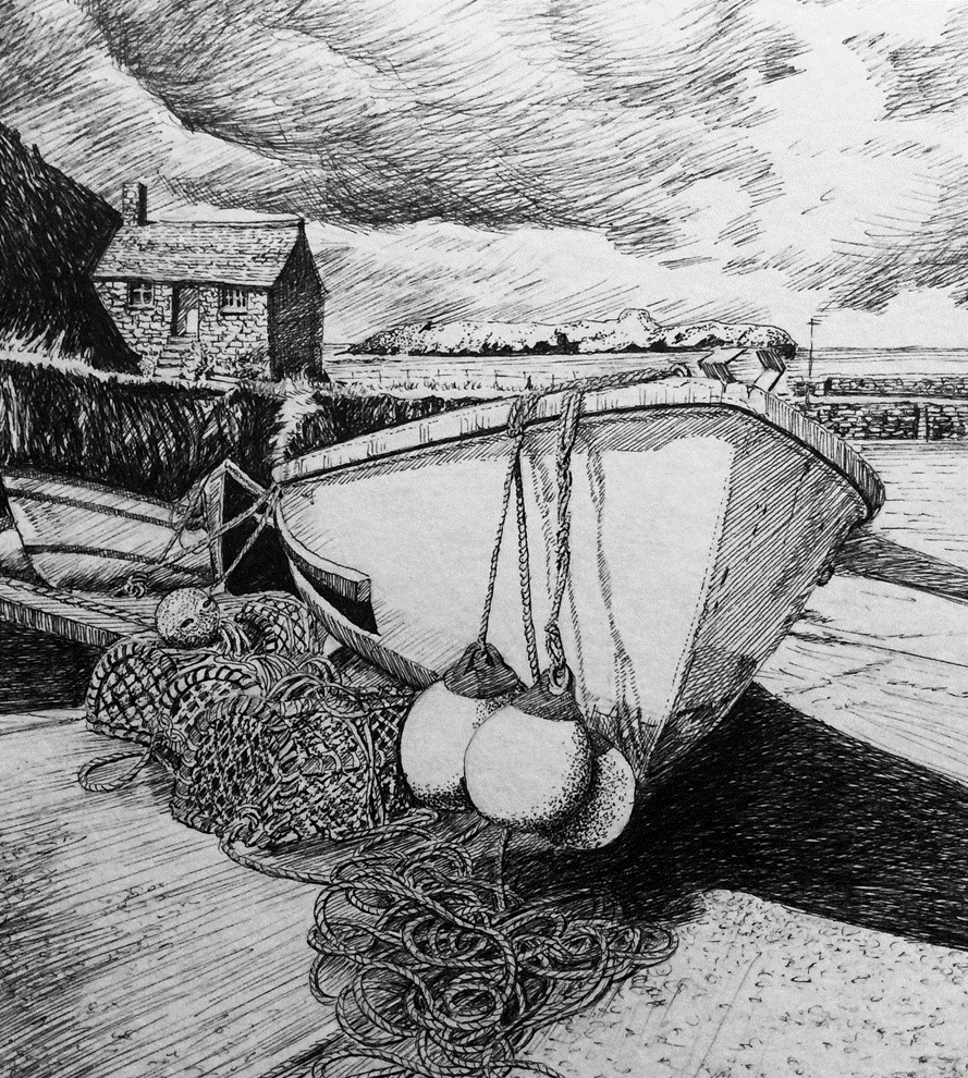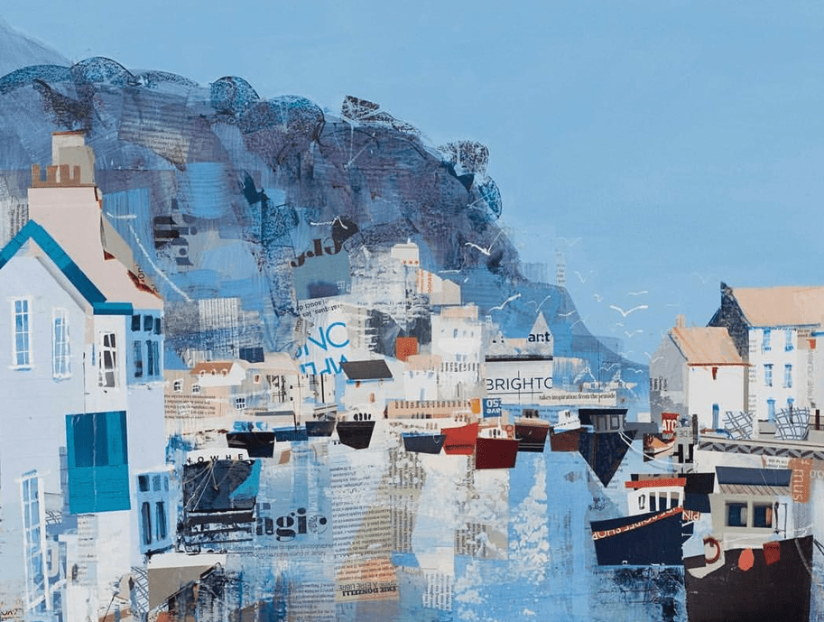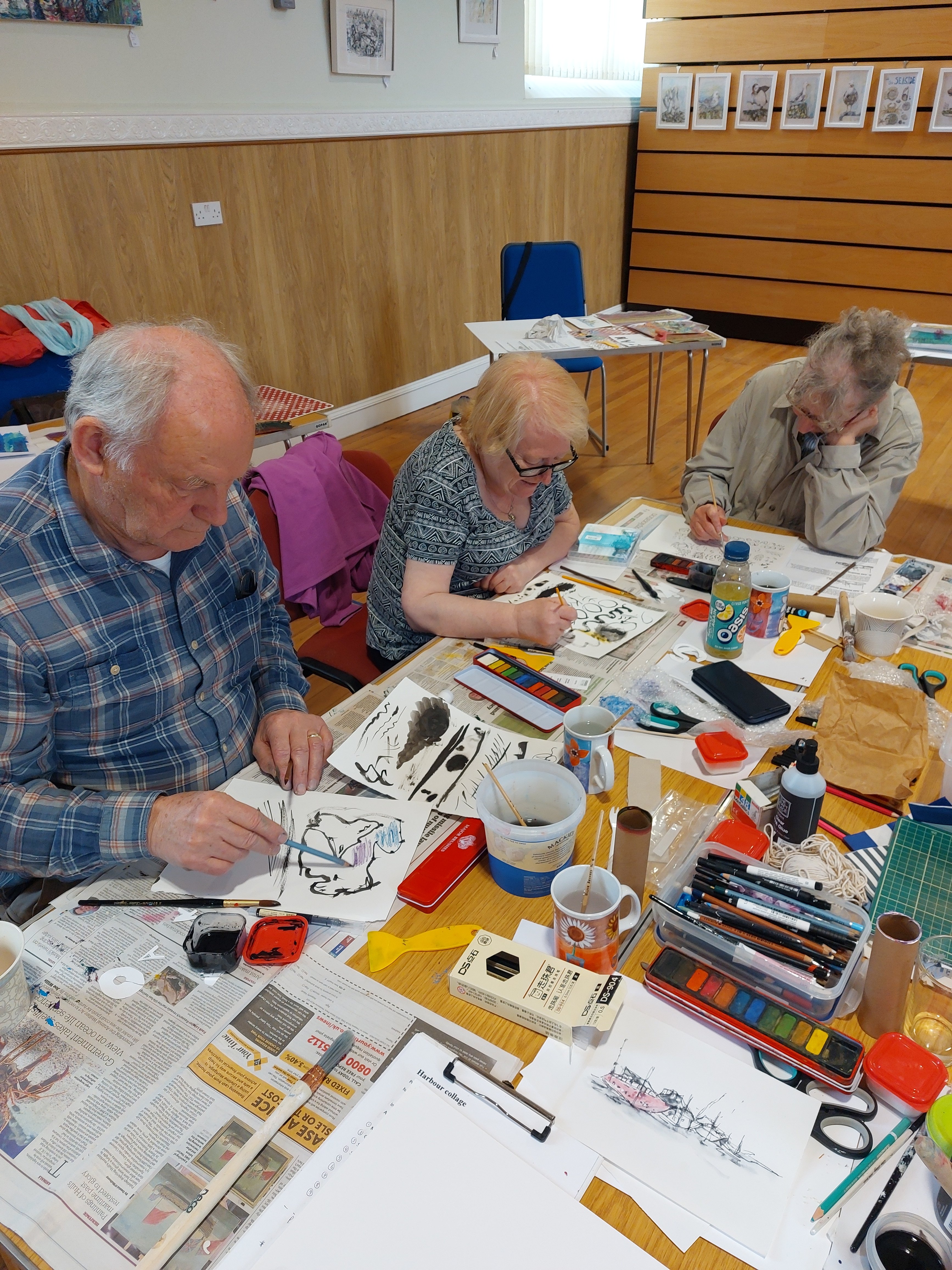 This workshop focused around creating a Harbour collage from scraps of pre painted papers and using ink and line to draw on details.