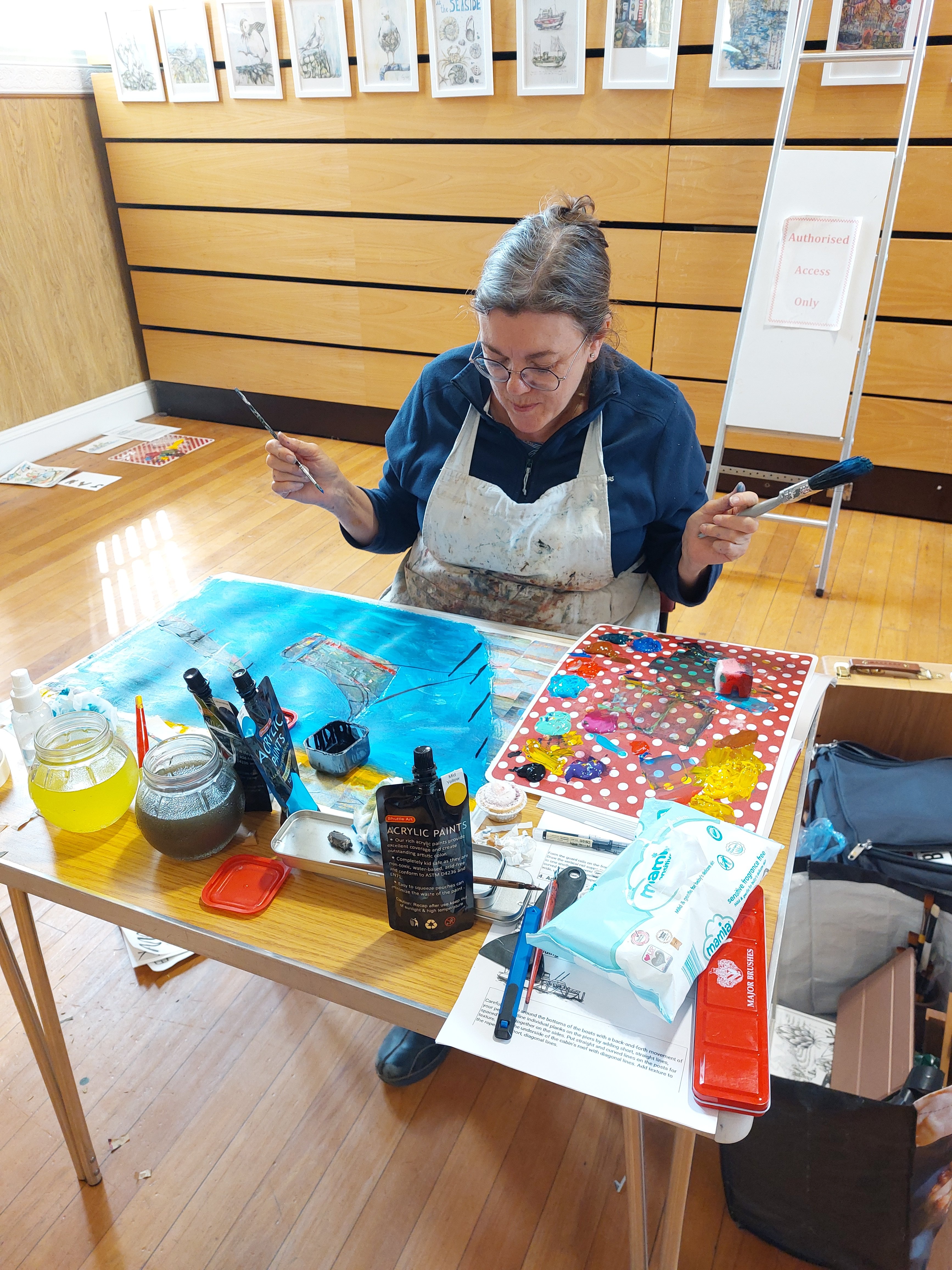 What we liked in the workshop was the free line and mark-making techniques, mixed media and layering effects using scraper tools and stencilling.