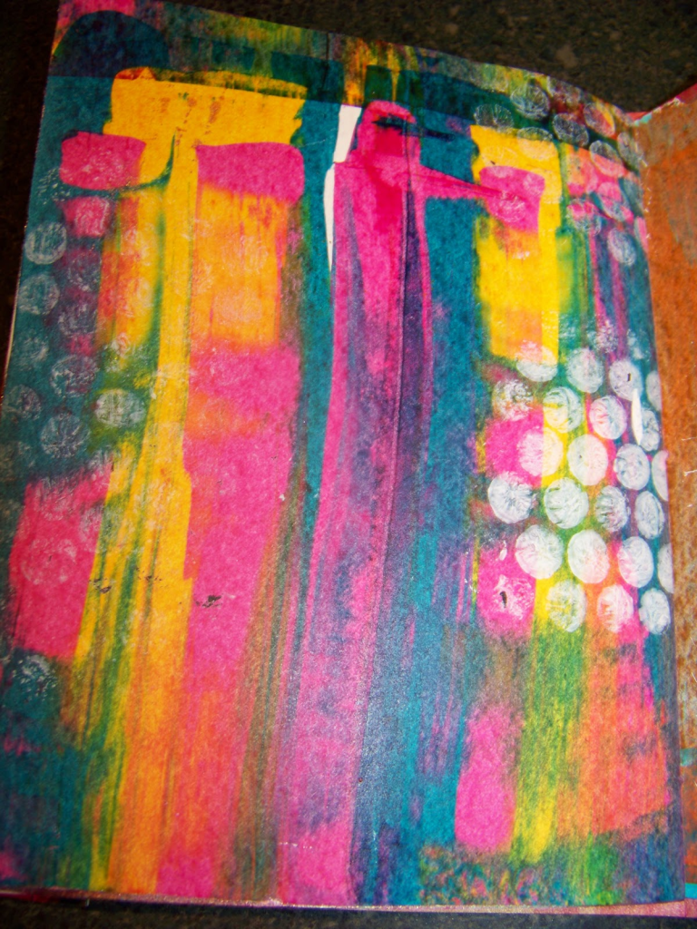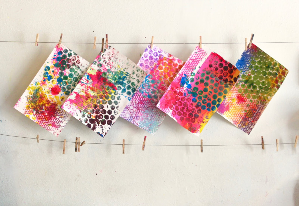Printing acrylic anything can be used to print, even fingers. Bubble wrap is a favourite, or scrunched paper