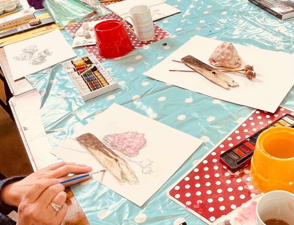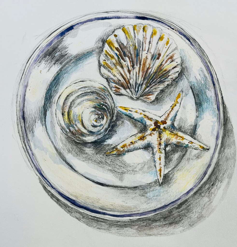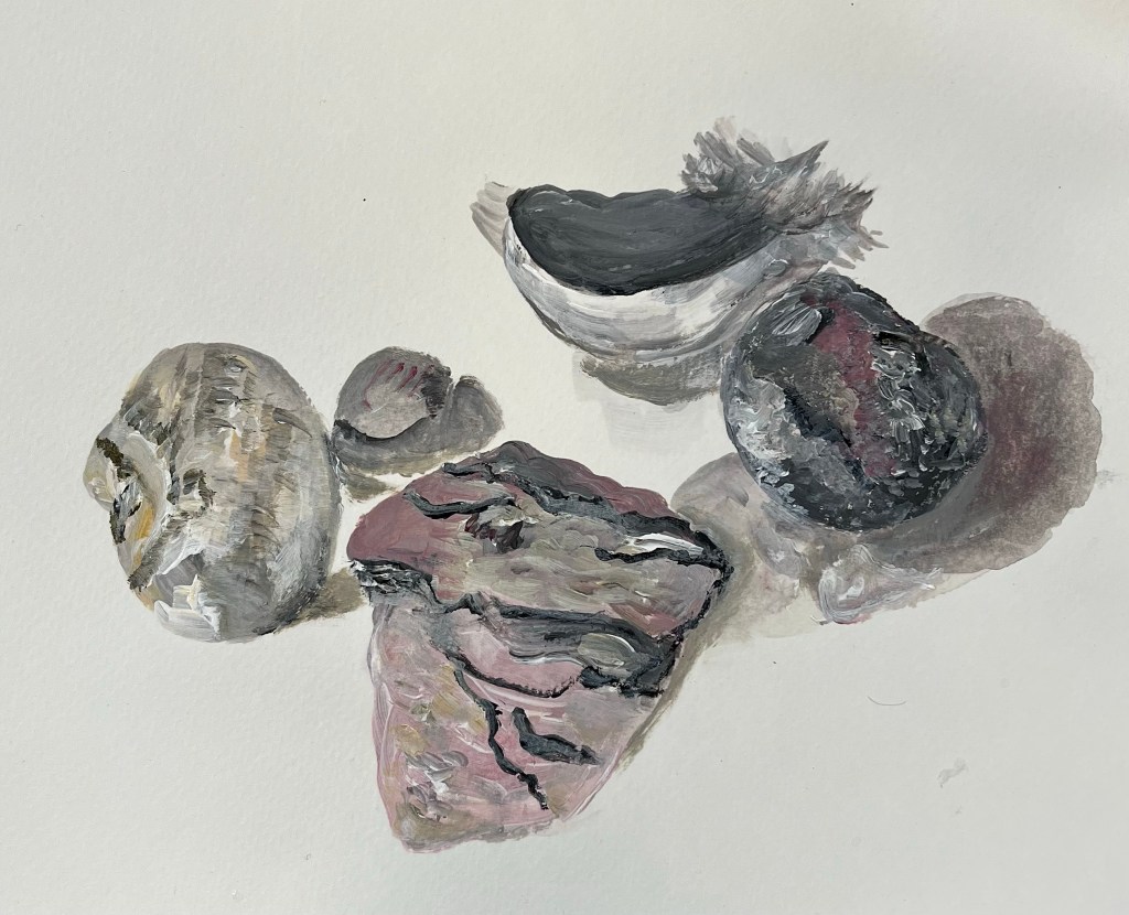 Collect THREE found objects which you feel compliment each other. ( This can be the same or different from items those you have already drawn) Using any media you feel best suits – the textures and colours of the objects, create an A4 detailed drawing or painting. Your objects could be a still life arrangement or separated out on the paper.