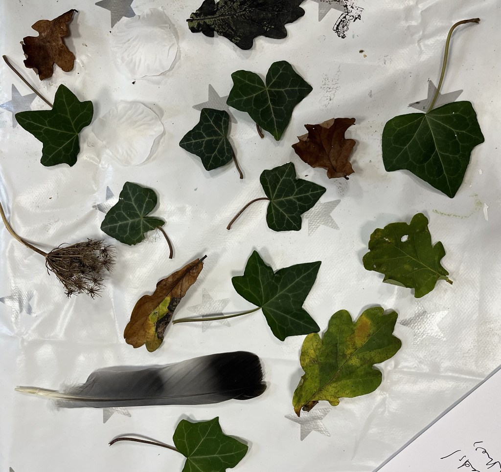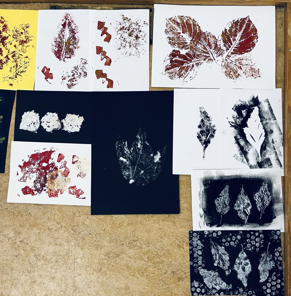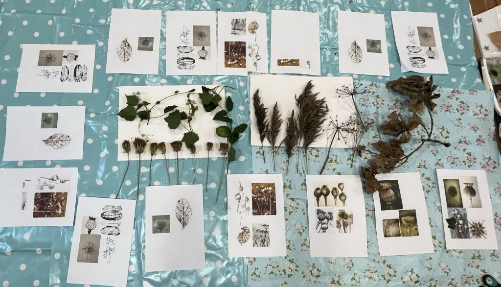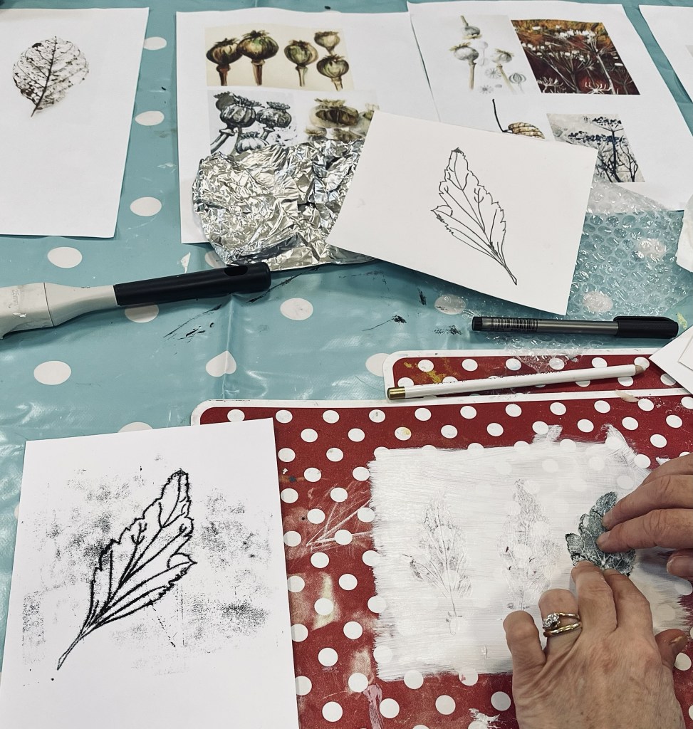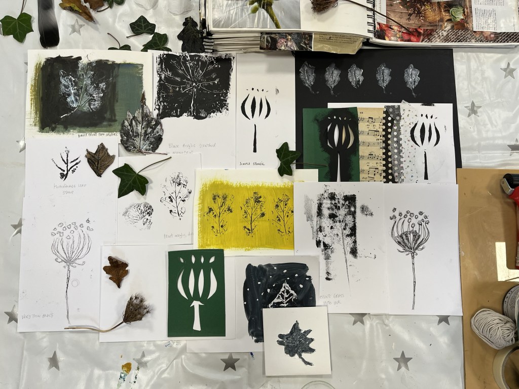 Using a combination of photographs, leaves, seed heads and petals, we printed from actual objects, inking them up and playing with textures, made stencils, cut into potatoes to make stamps and inked up plates to create mono prints.