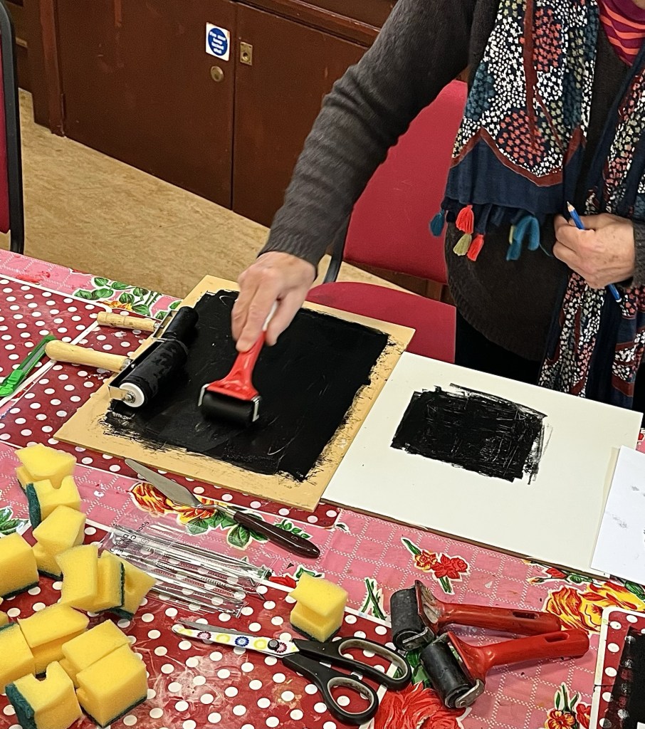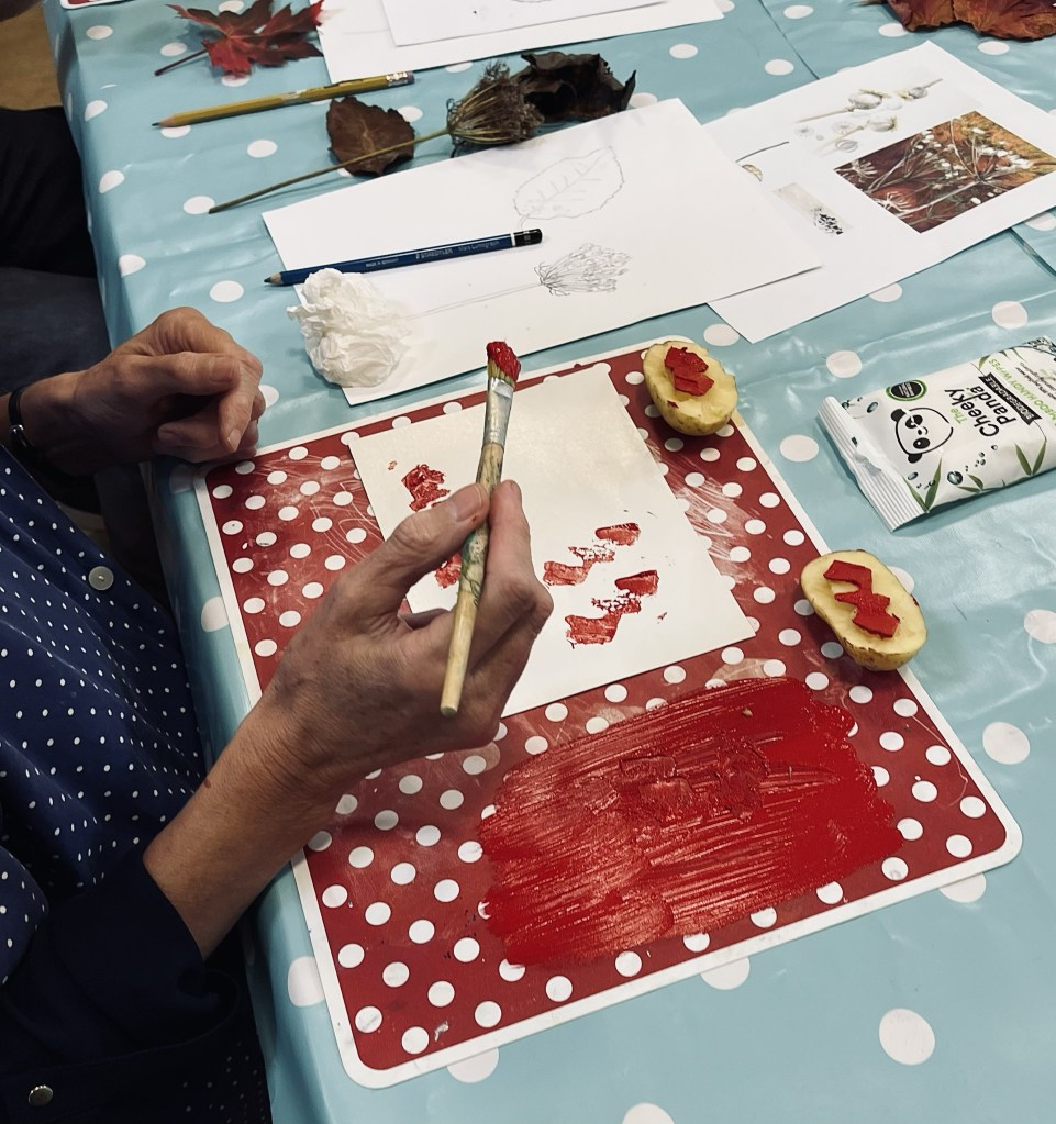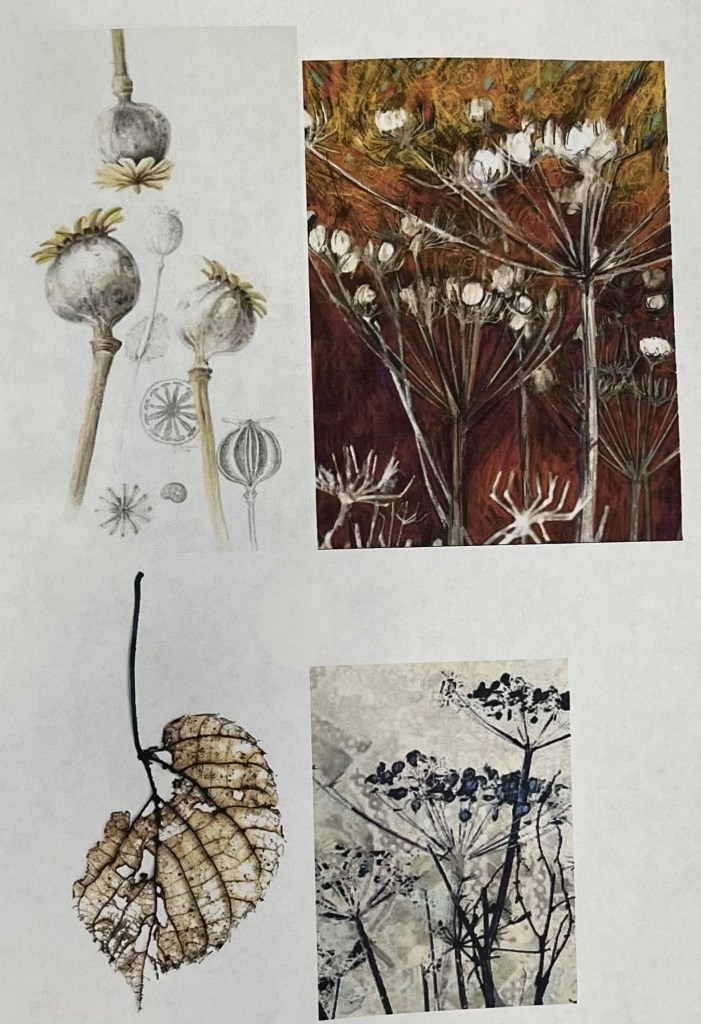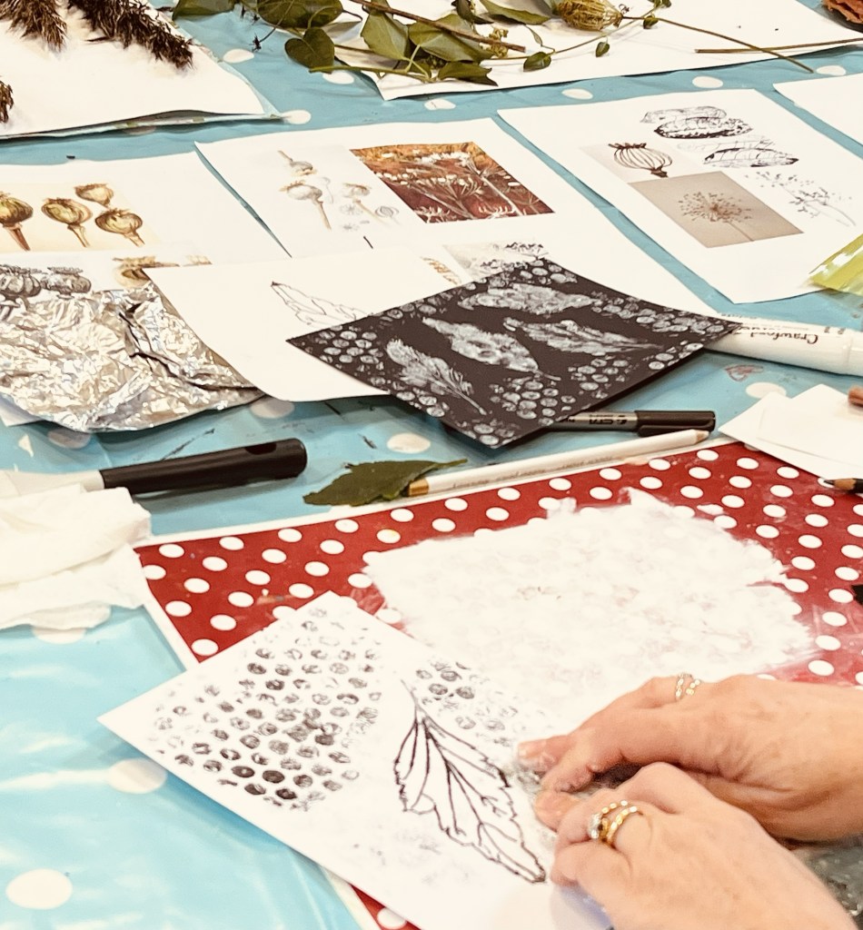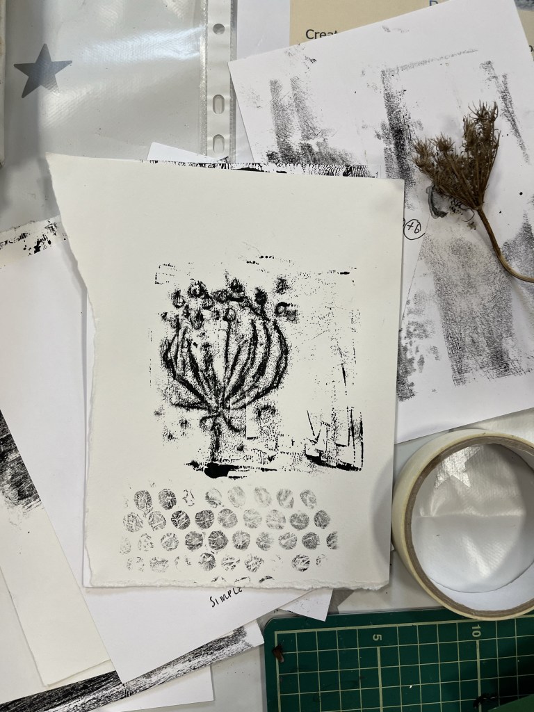 Using a combination of photographs, leaves, seed heads and petals, we printed from actual objects, inking them up and playing with textures, made stencils, cut into potatoes to make stamps and inked up plates to create mono prints.