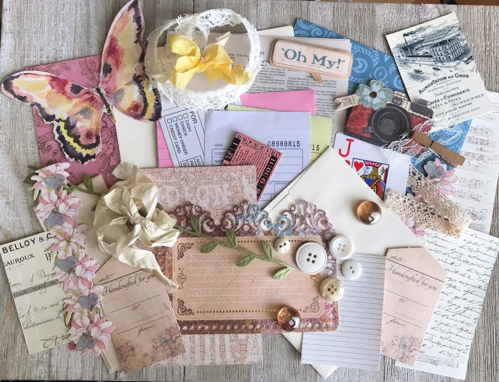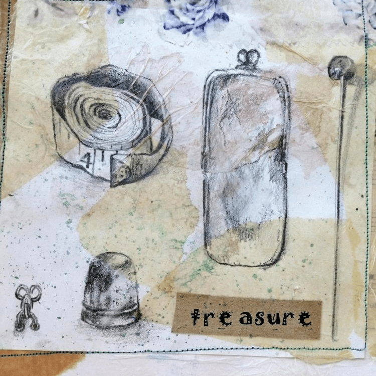 - Look for items around your home, from your memory box , a walk in the garden, jumble sales, charity shops or craft shops . You are bound to find tons of interesting things to fit onto your collage!