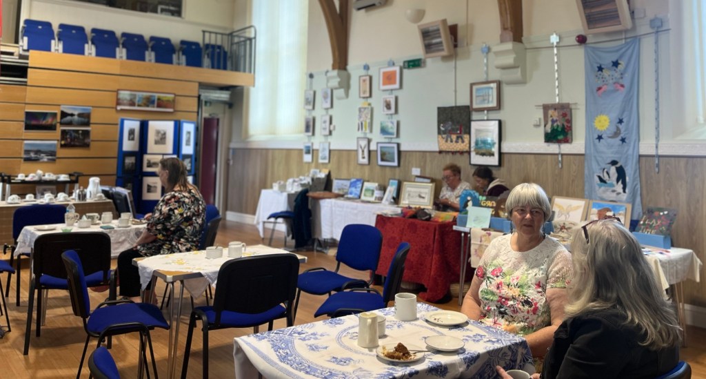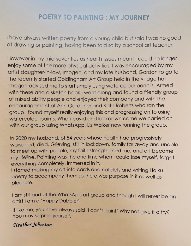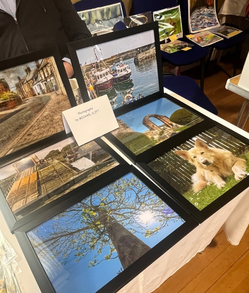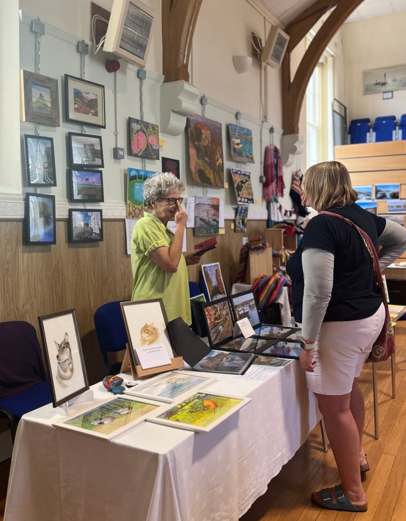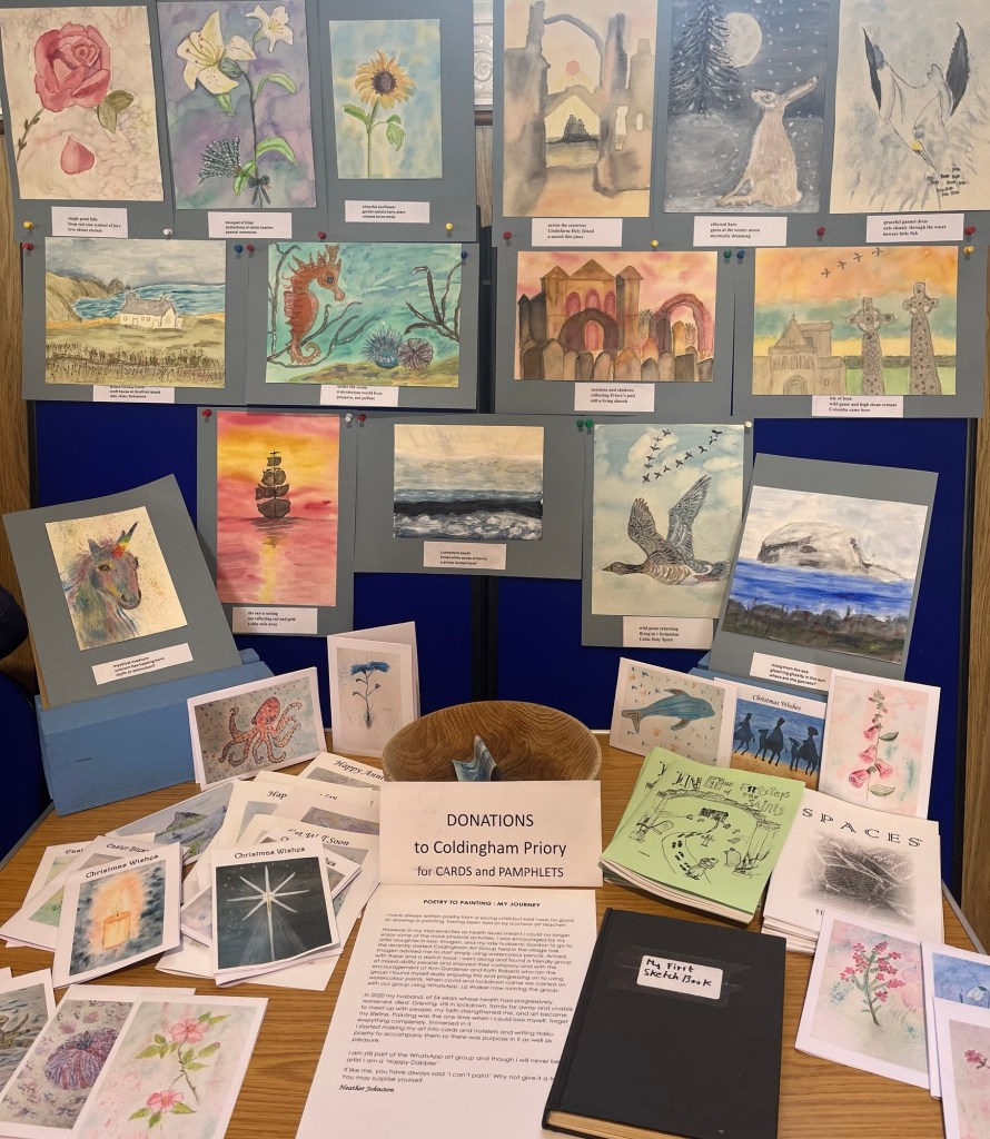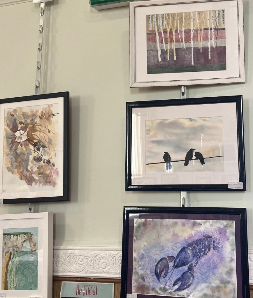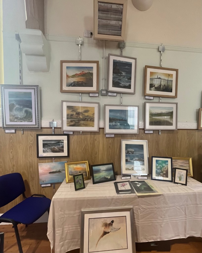 On Saturday, I was delighted to spend the day with Coldingham Art group, who I was fortunate to teach until moving to Devon. Some of you will recognise familiar names from the weekly joint galleries where contributors share their Artwork with each other. The exhibition was a celebration of their different skills and styles, as well as other creatives from the local community such as photography, crochet, and stitch.
