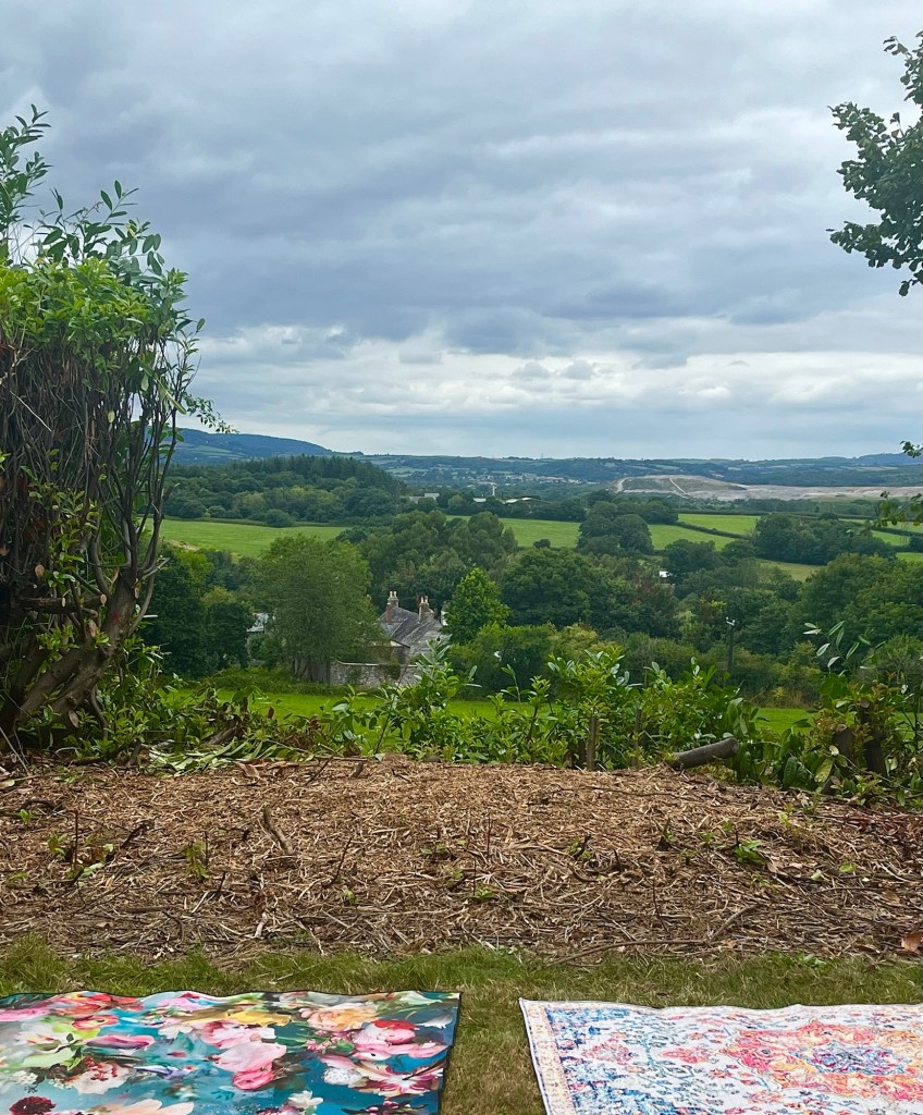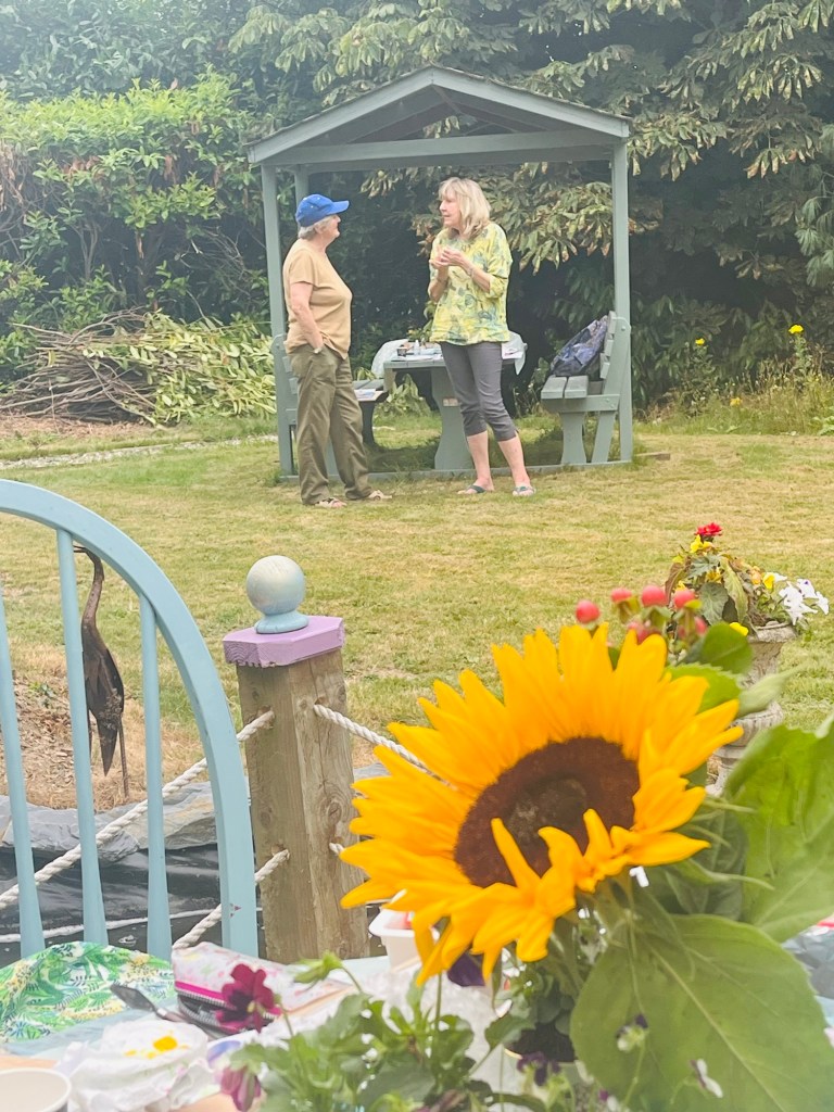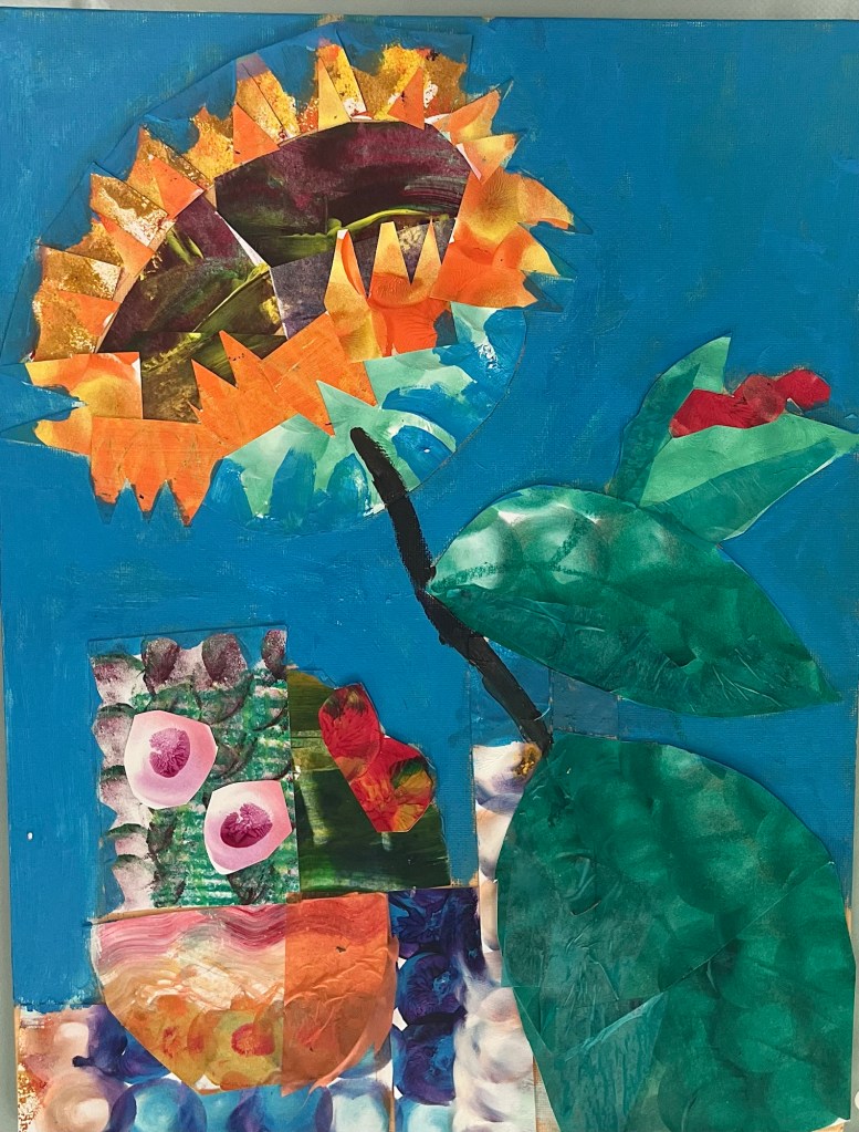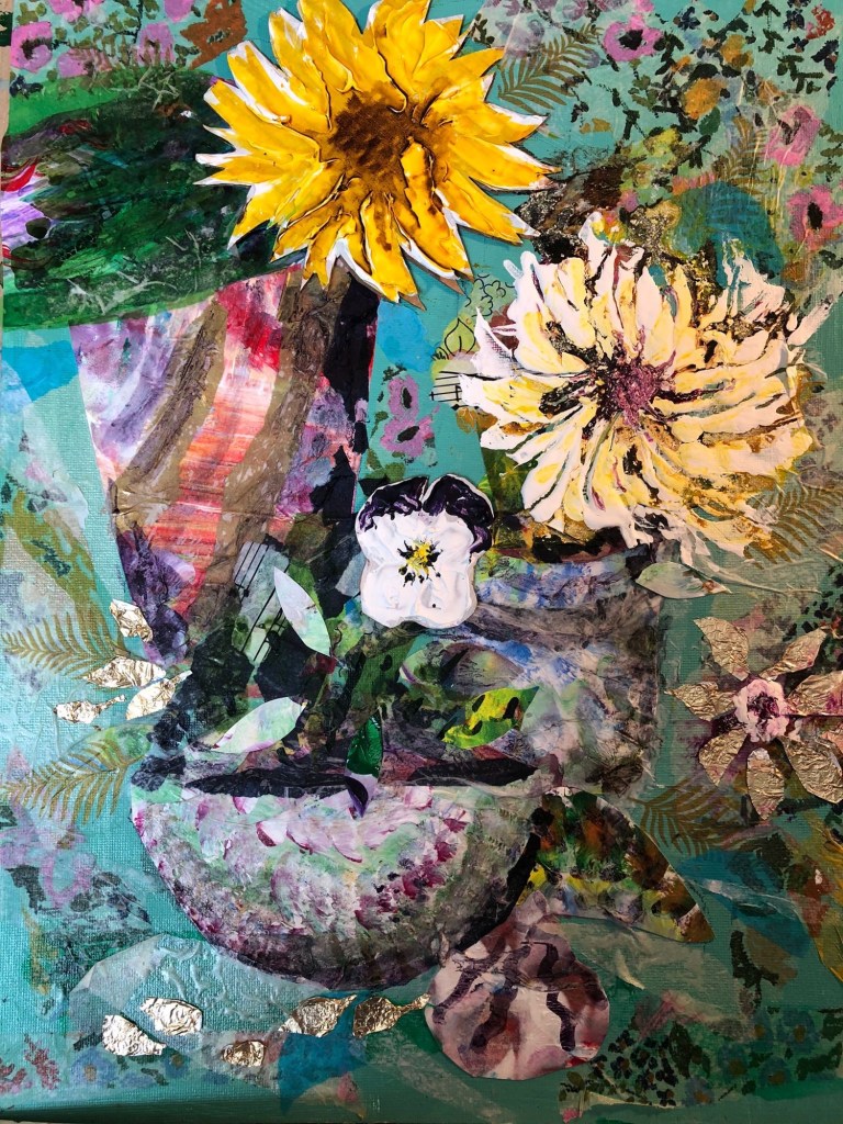 This weekend we held a Summer workshop at our home studio. The theme was flower still life – against a background of trees and the newly unveiled view at the end of the garden. It was a day of play and experimenting, using a range of different art materials and finally building up to a collage piece on canvas board. We looked at different techniques and ideas,.