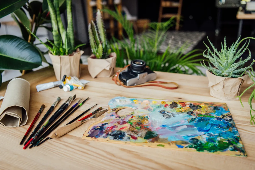 The scene was set Boards, acrylic paints, inks, papers, boxes of tools and brushes lined up and ready to go.