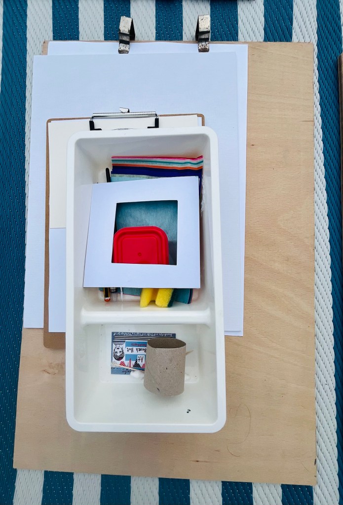 After priming the boards for later, the Artists drew quick sketches through card viewfinders from various sections of still life and landscape. Artwork could be as abstract or composed as they chose. At this stage they experimented using ghesso on scrap boards to let these dry and play with inks or paint on top later.
