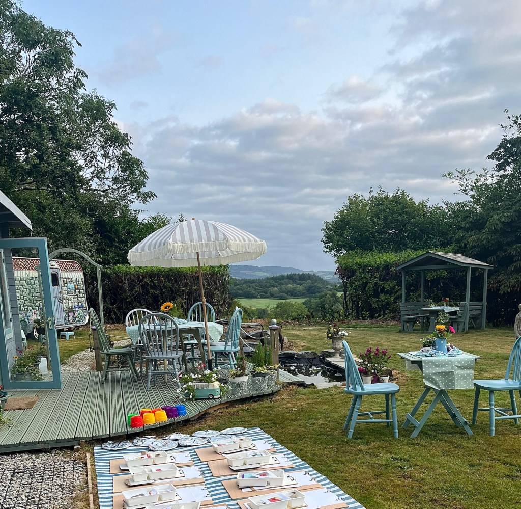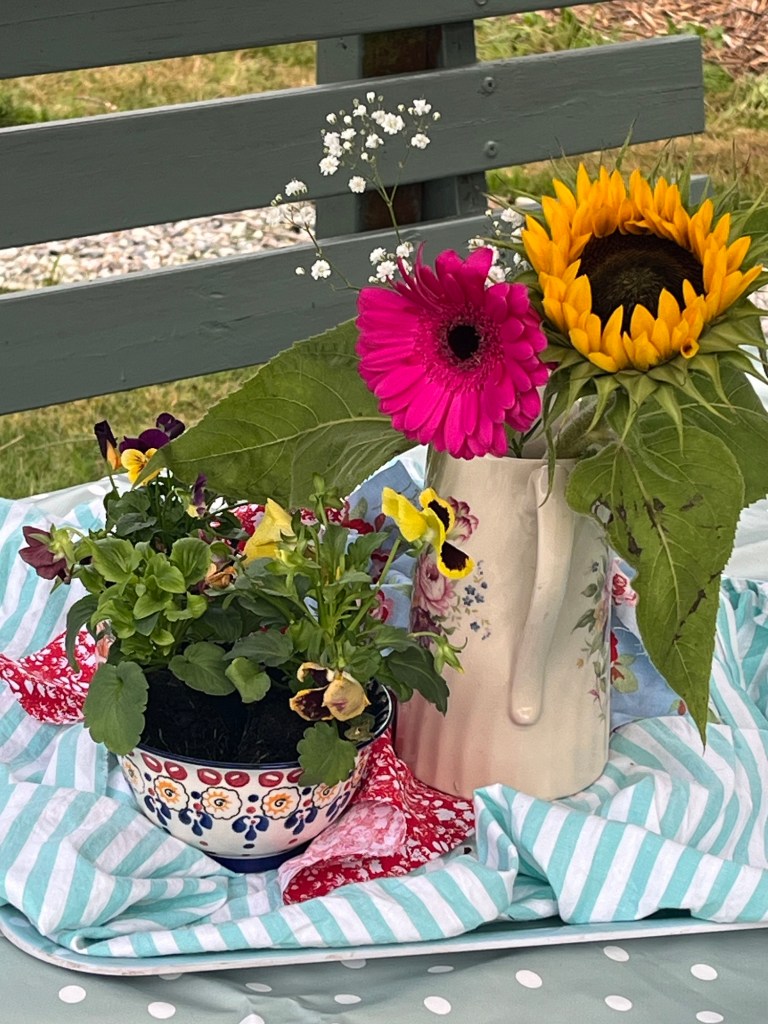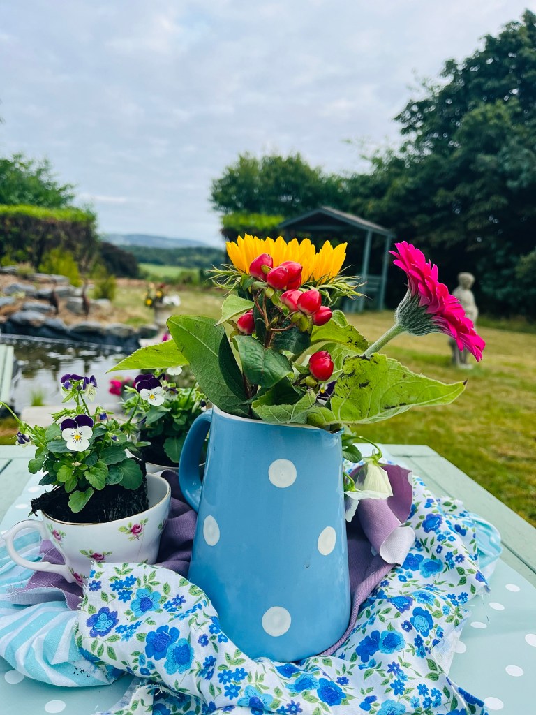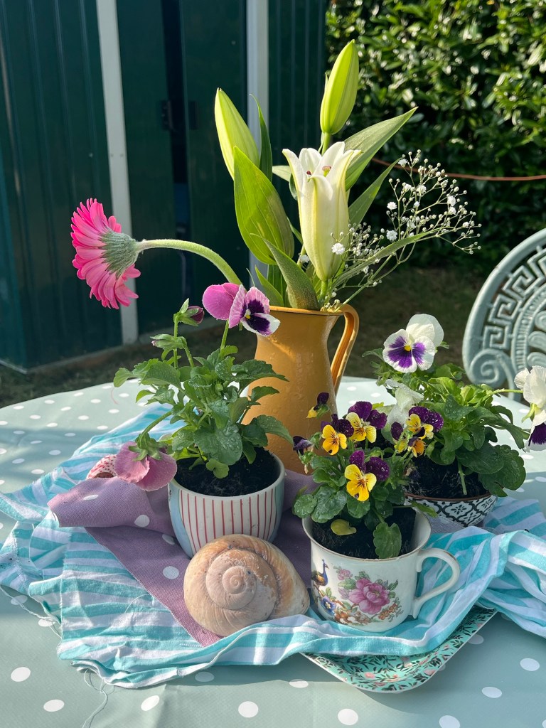 Each table held a still life mix of flower and print fabrics, shells, violets in teacups and painted bowls and jugs of fresh flowers.