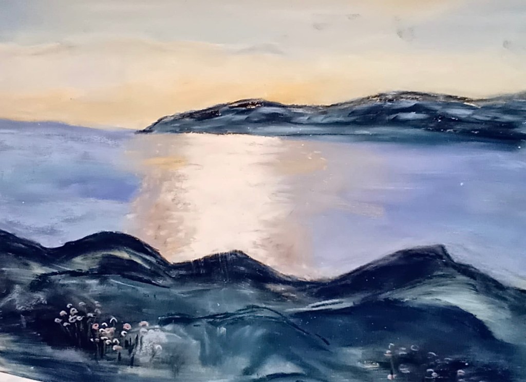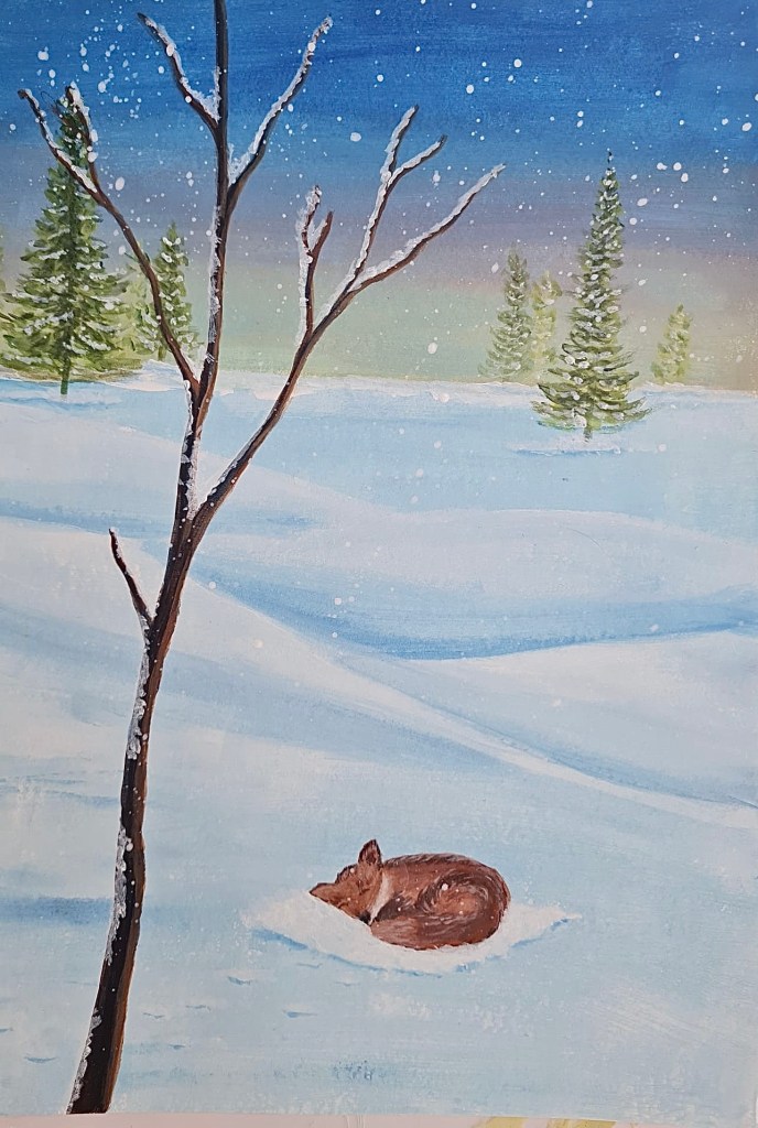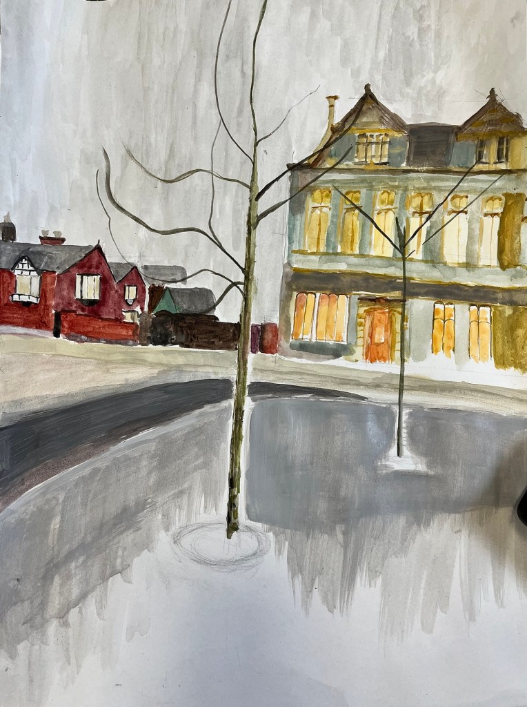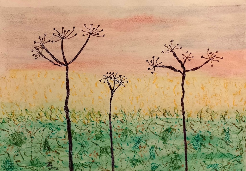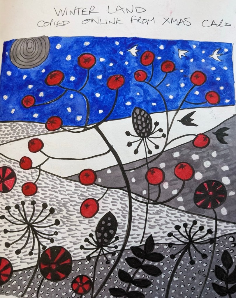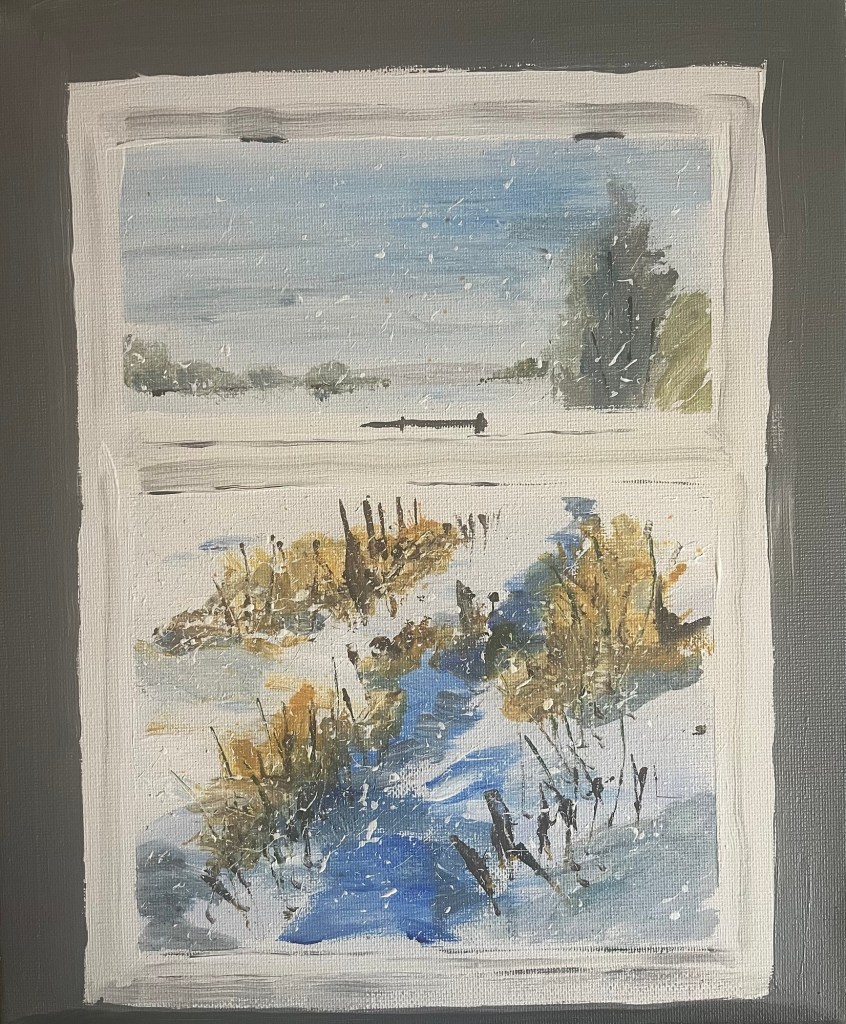 Nothing bleak about these midwinter paintings. Softly capturing the poetry of the changing landscape with blues and greys, and pops of paynes grey, reds and black, scratchy branches, pools of light and feathery skeleton leaves and shadows. A palette of poetry.