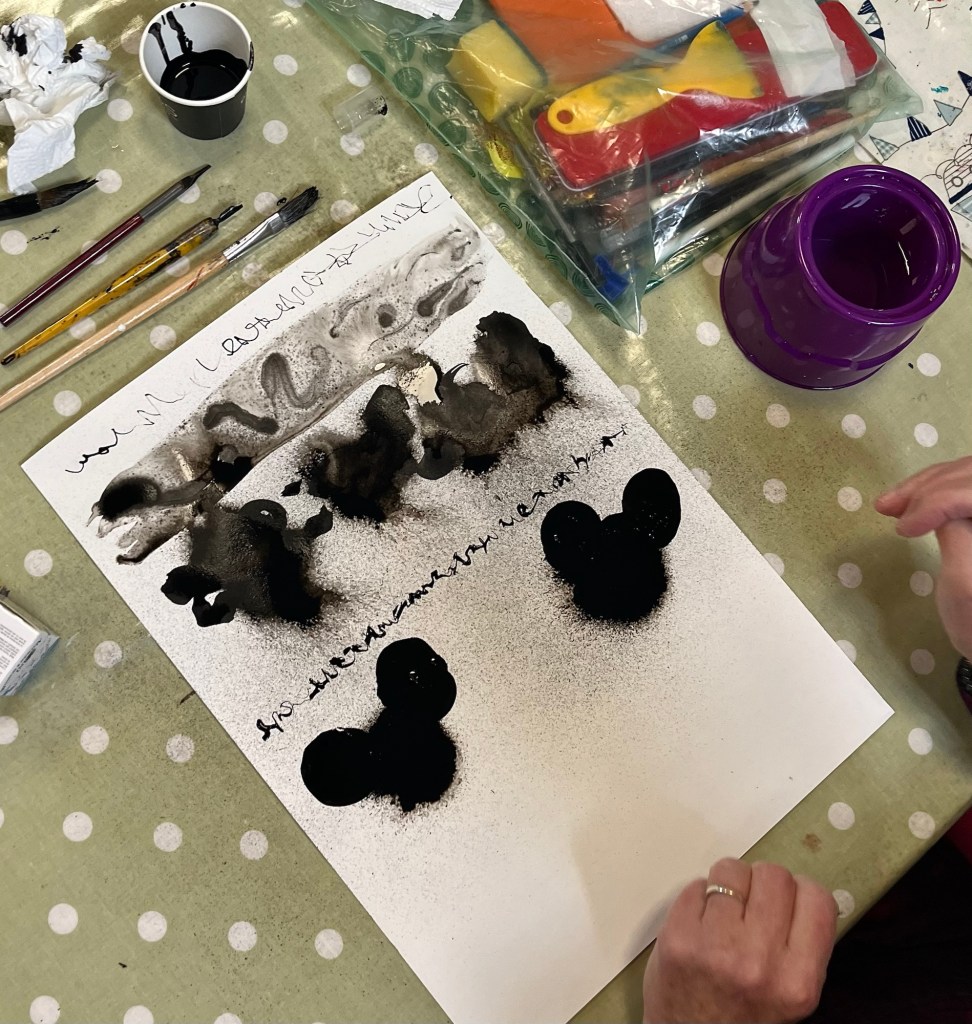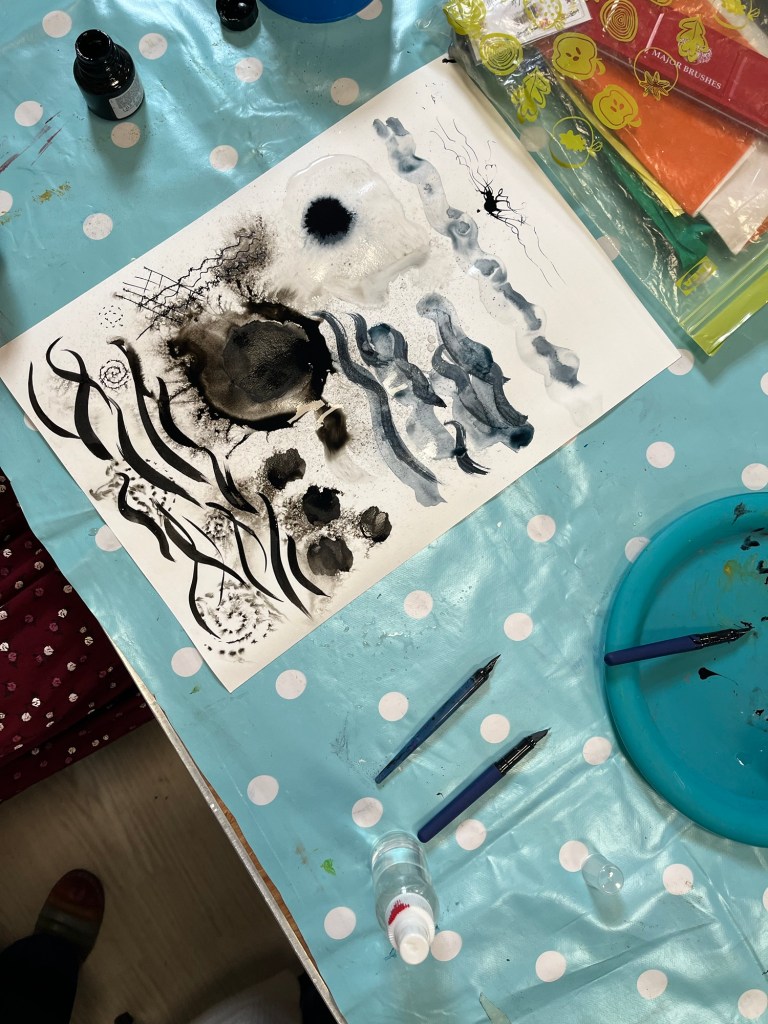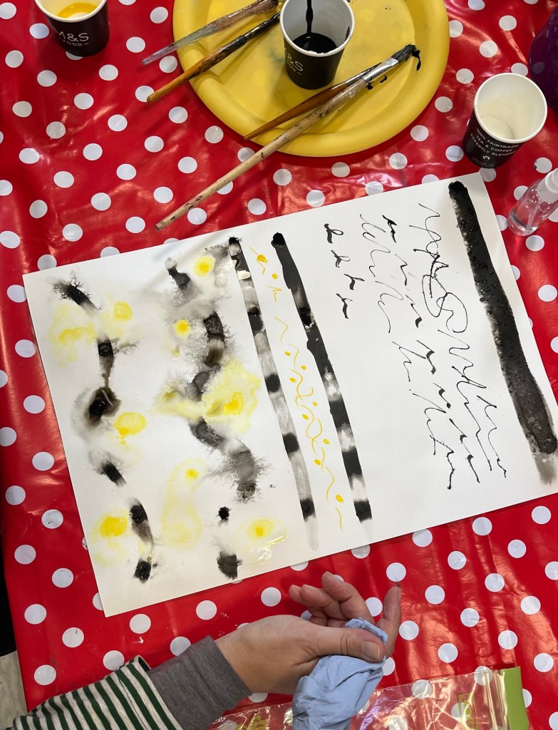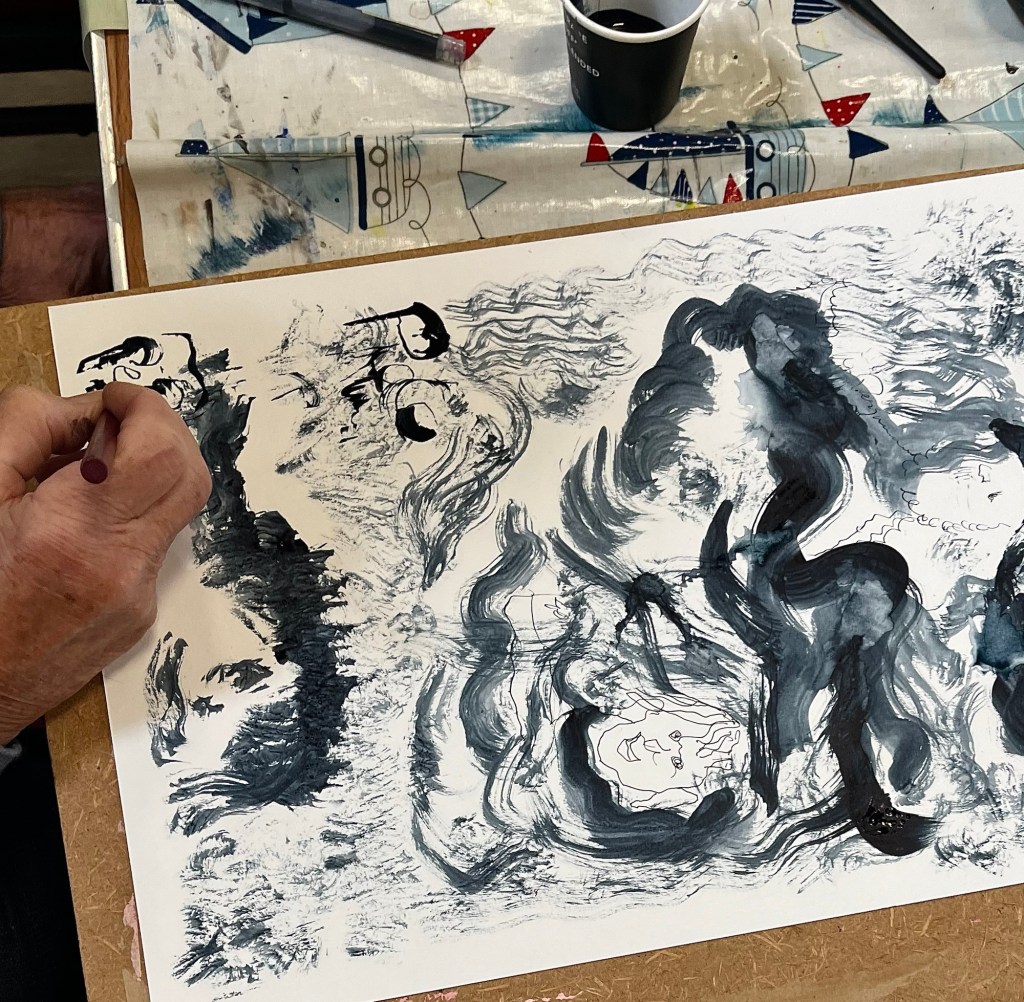 Before we began our painting today, we unearthed a box of old drawing pens and squirty tools, sprays and Chinese brushes, playing with textures and mark-making, loosening the hands and minds and gestures. The results were fabulous and even more so were the looser drawings which followed. Well done on a great morning’s creating!