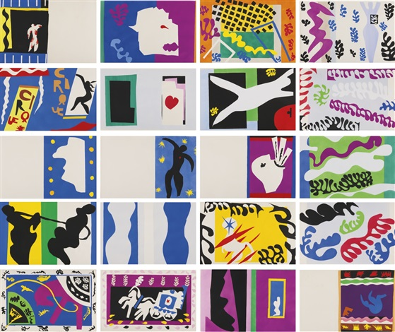 After surgery in 1941, Matisse was often bedridden; however, he continued to work from a bed in his studio. When necessary, he would draw with a pencil or charcoal attached to the end of a long pole that enabled him to reach the paper or canvas. His late work was just as experimental and vibrant as his earlier artistic breakthroughs had been. It included his 1947 book Jazz, which placed his own thoughts on life and art side by side with lively images of colored paper cutouts. This project led him to devise works that were cutouts on their own, most notably several series of expressively shaped human figures cut from bright blue paper and pasted to wall-size background sheets (such as Swimming Pool, 1952).