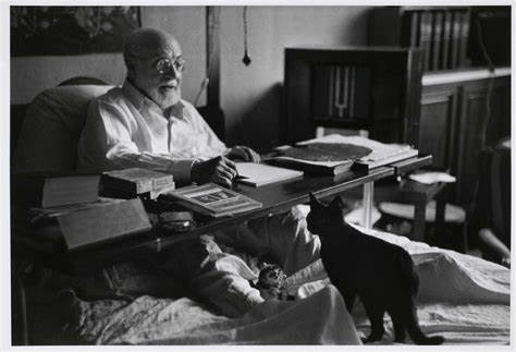 Matisse in bed creating works with paper.