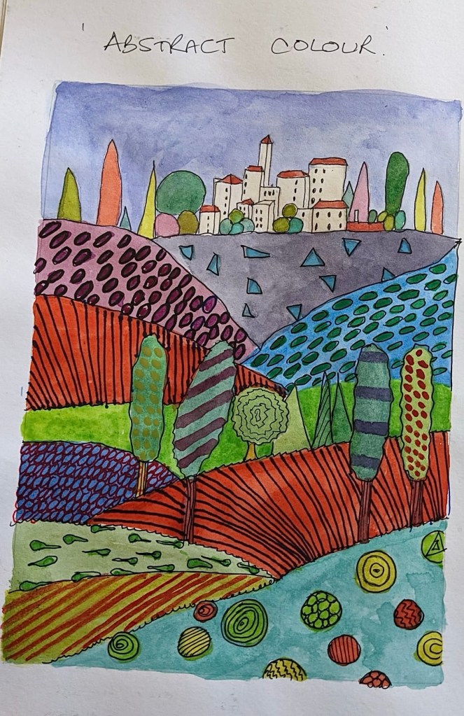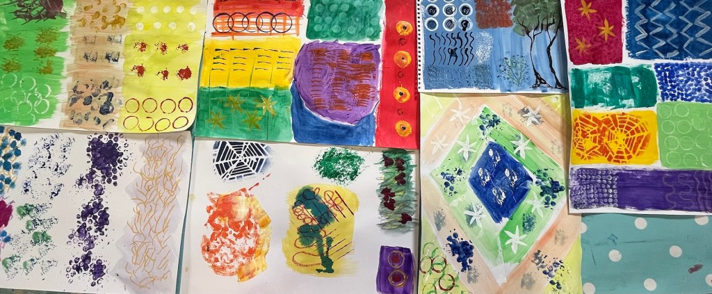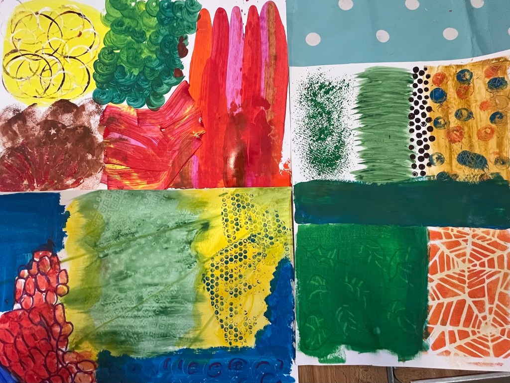 We looked at a few examples of abstract art and then painted several sheets of paper in thin layers of acrylic. Using a huge basket of found objects, art tools, everyday shapes such as tubes and sticks and stencils, each coloured sheet was printed, scratched, scribbled on, stamped, stencilled and treated to a mixture of marks and colours. Surprises were found with materials and methods, colour combinations and just how much fun it can be to get messy!