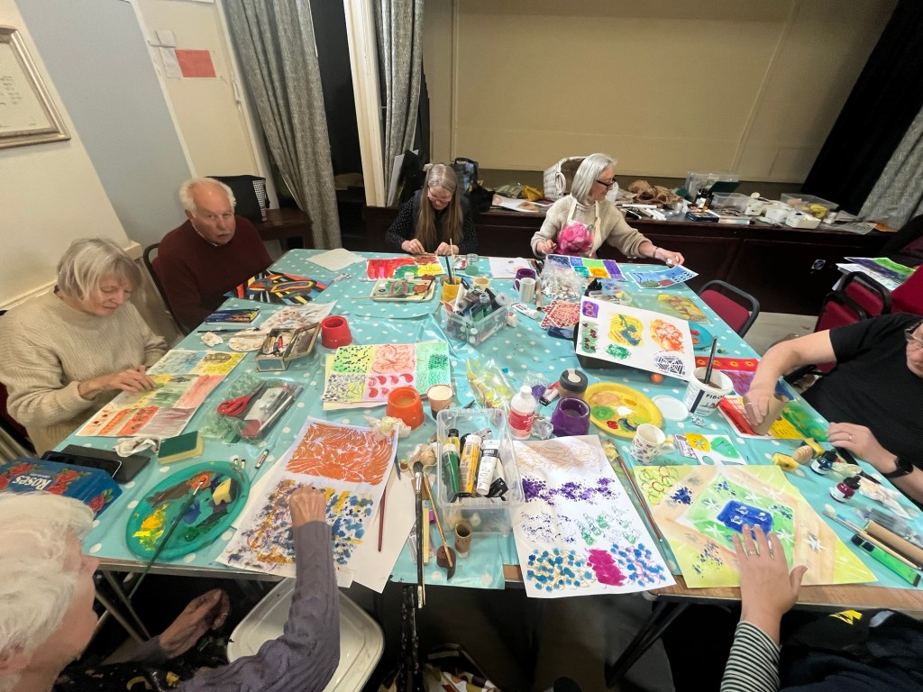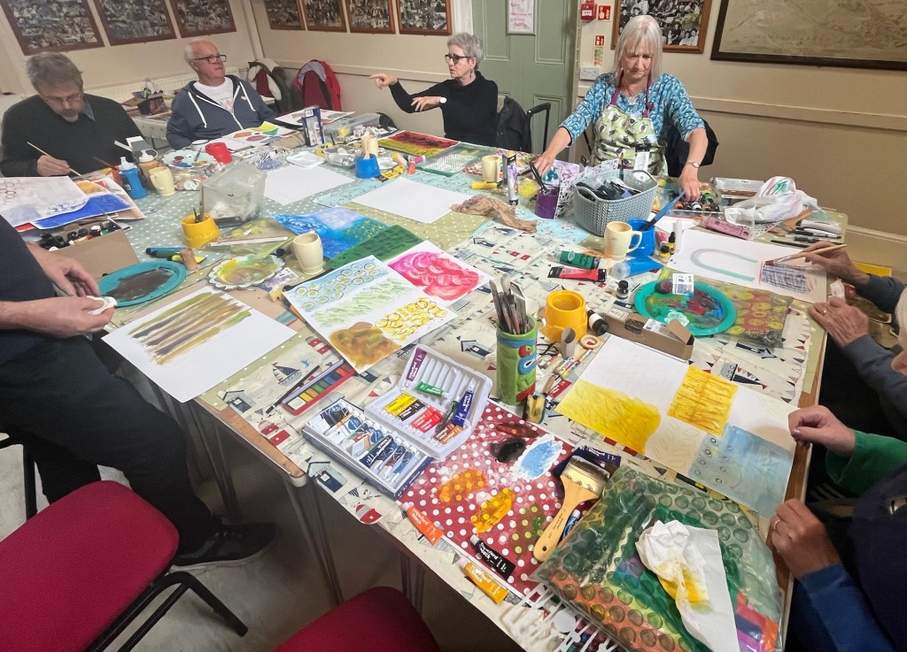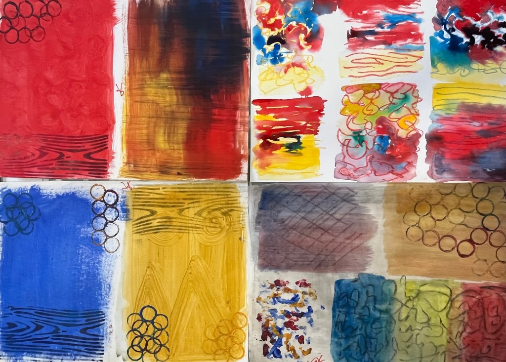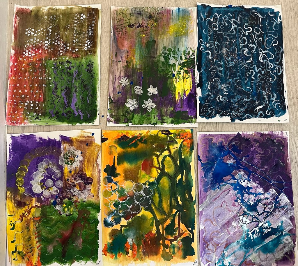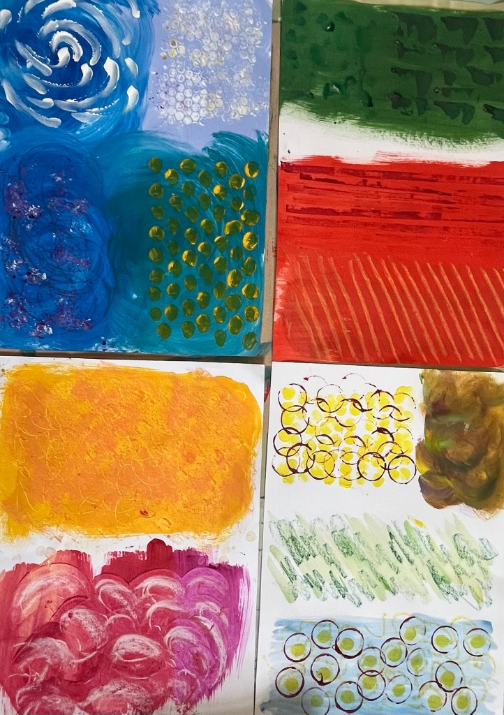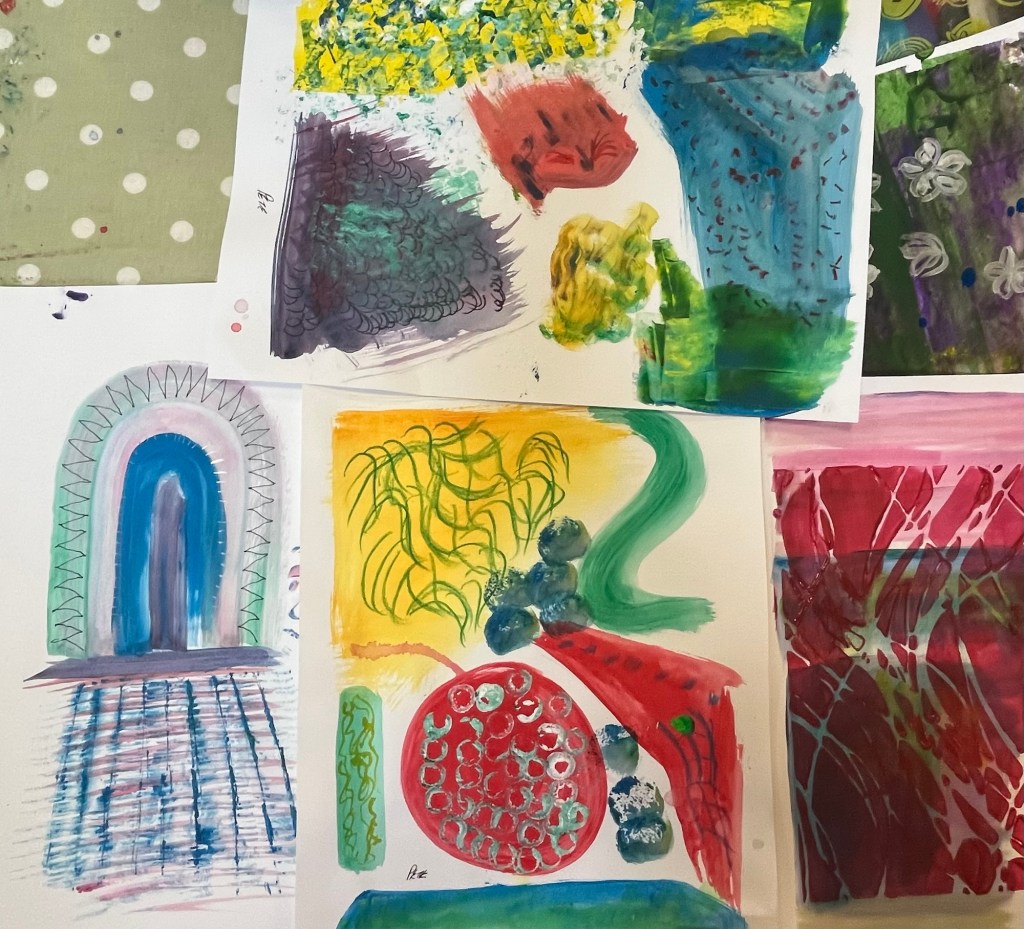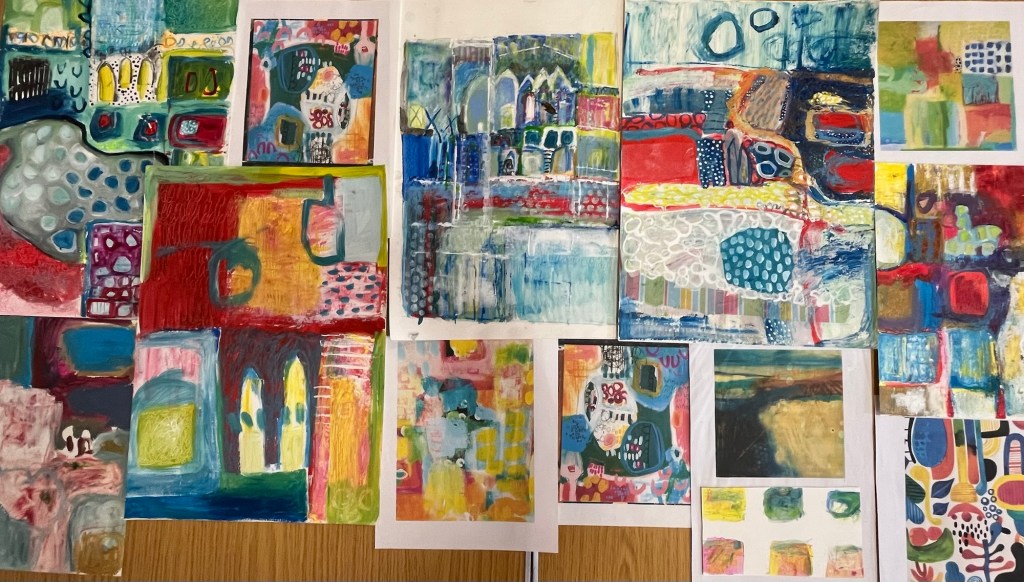 Today was a riot of painting and experimenting with materials, techniques and colour. Pure play therapy! Next time, these collage papers will get pieced together, for the next stage of composition. However, a few Artists have already made a start on their abstract journey!