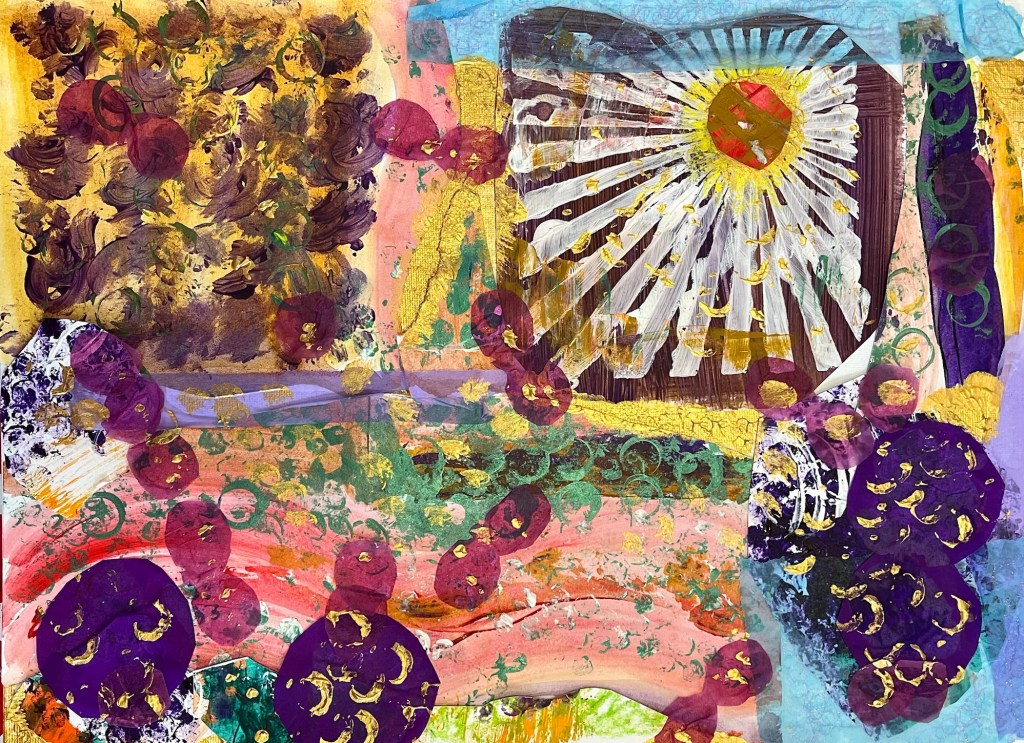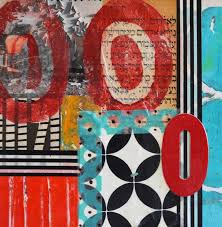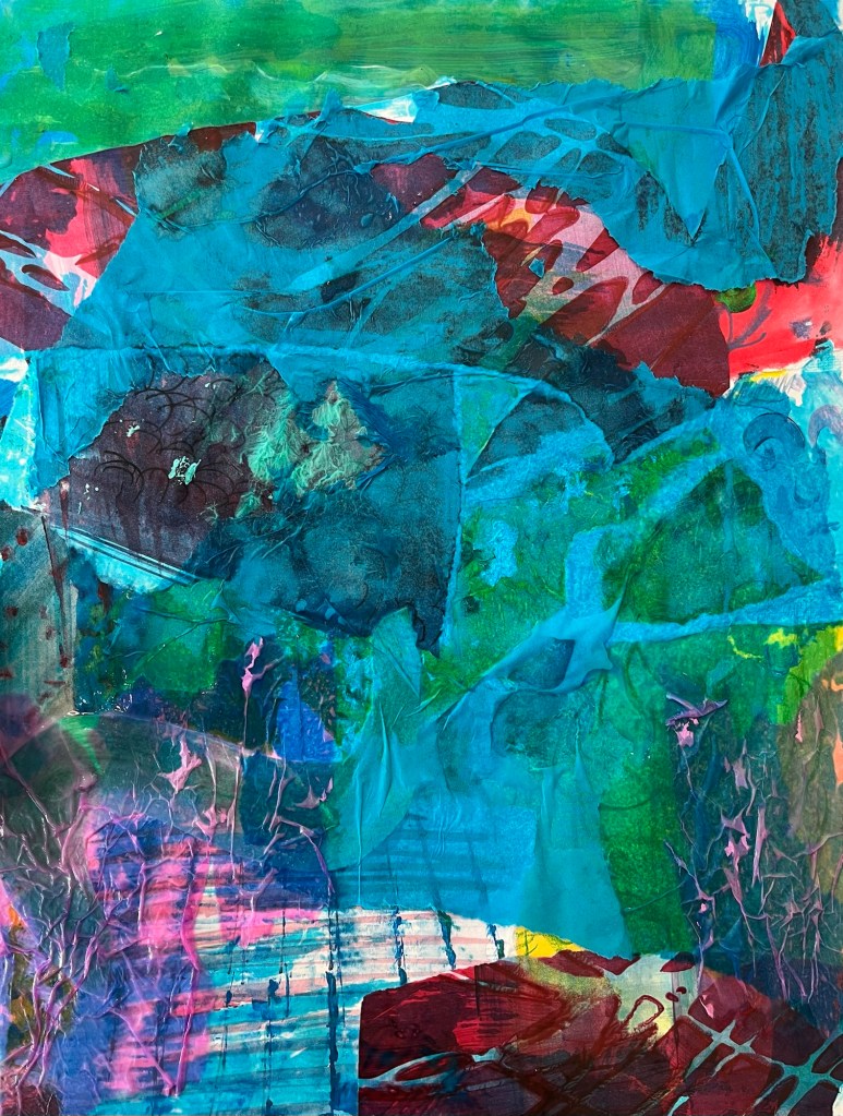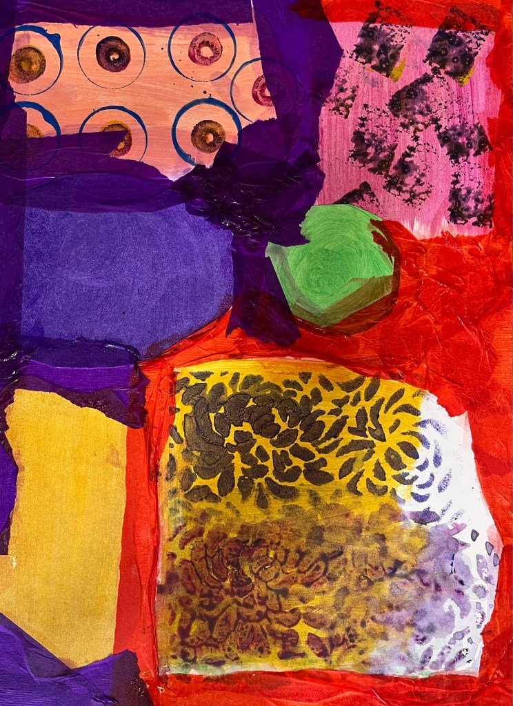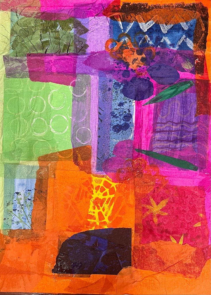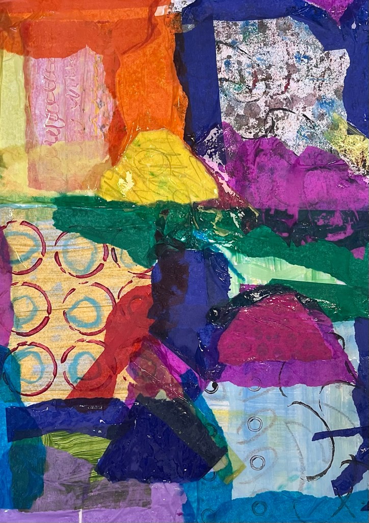 An introduction to abstract collage- using pre made collage papers, tissue, paint, print pens and stencils.