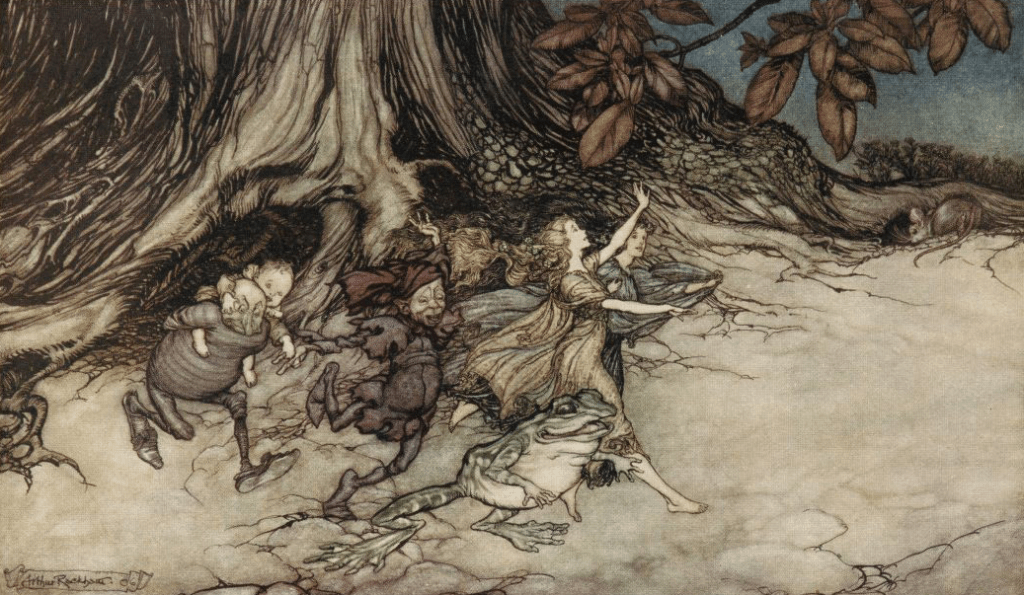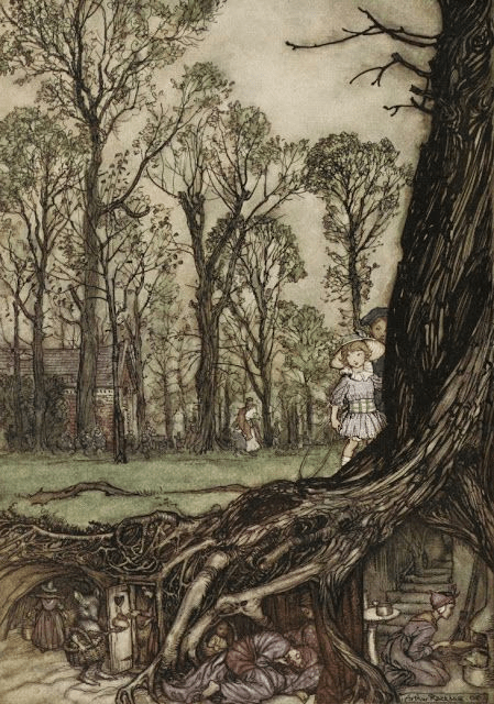 Arthur Rackham (1867 – 1939) is widely regarded as one of the leading illustrators from the ‘Golden Age’ of British book illustration which encompassed the years from 1900 until the start of the First World War. Arthur Rackham’s works have become very popular since his death, both in North America and Britain. One of the wonderful aspects of his work is his trees and in particular, twisty branches and roots, hidden worlds and realms. Often depicted in monotone prints, pencil and ink his drawings are timeless and evocative illustrating fairy tales and poems.
