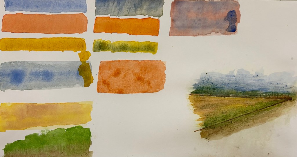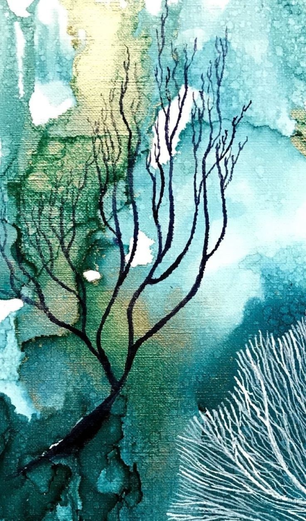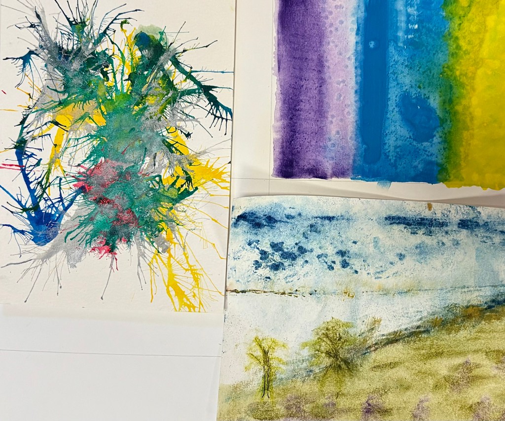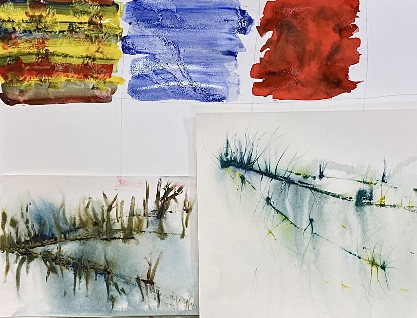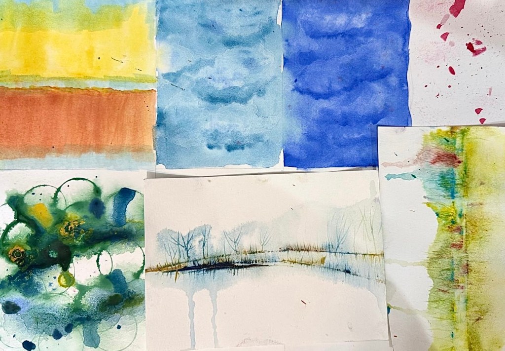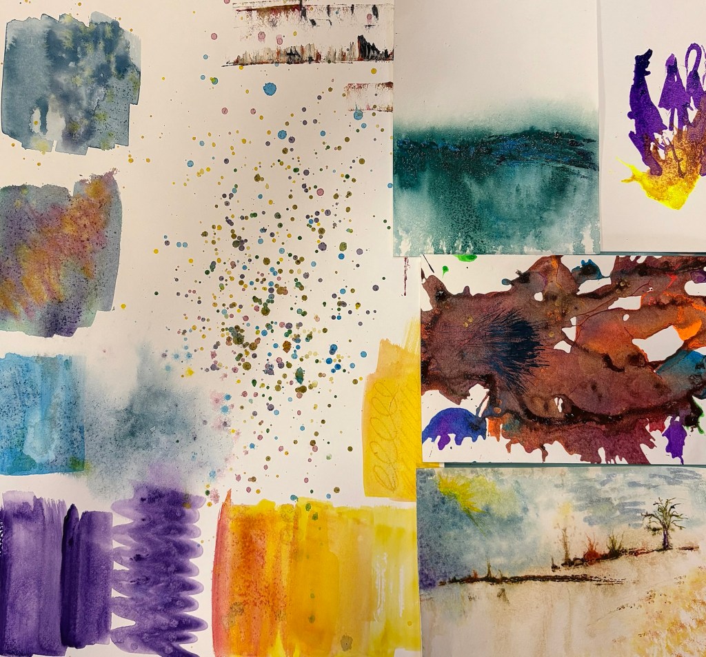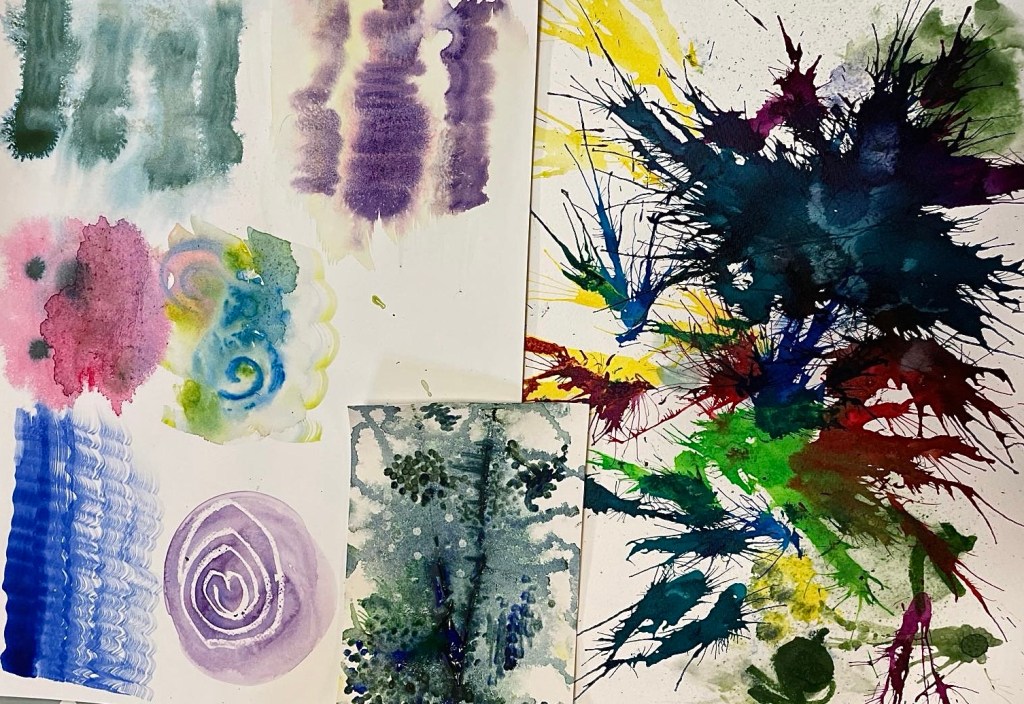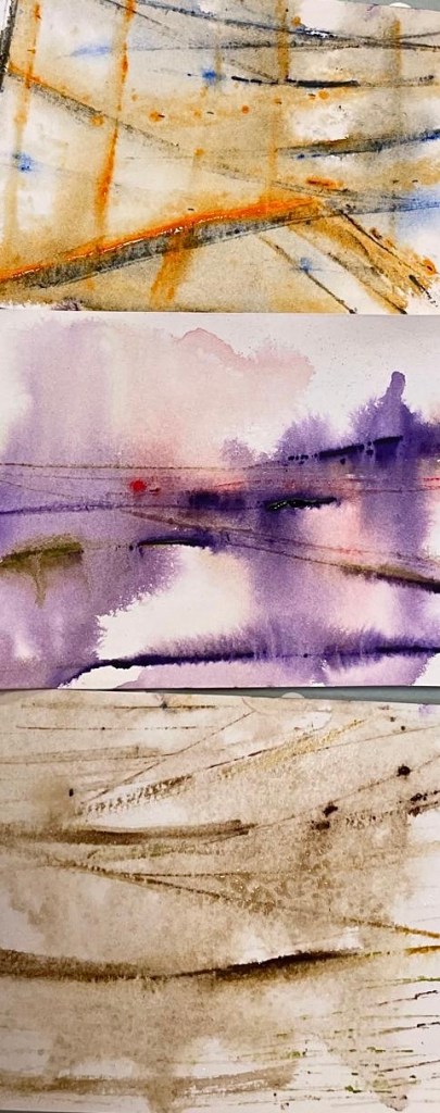 Today’s busy workshop in Devon was a relaxed and fun way to play with watercolour and inks, without the pressure of a final outcome. Experimenting with loose marks, wet on wet, bleeding and layering colours, adding salt, scratching with sticks, lifting with cotton buds and cotton wool, using neat liquid water colour and spray and later skooshing with an air blowing tool and adding an alcohol spray. Plenty of techniques to use at a later time and practice at home. But more importantly – allowing the freedom of spontaneity uncovers surprises; new ways of applying paints and materials we may never would have known.