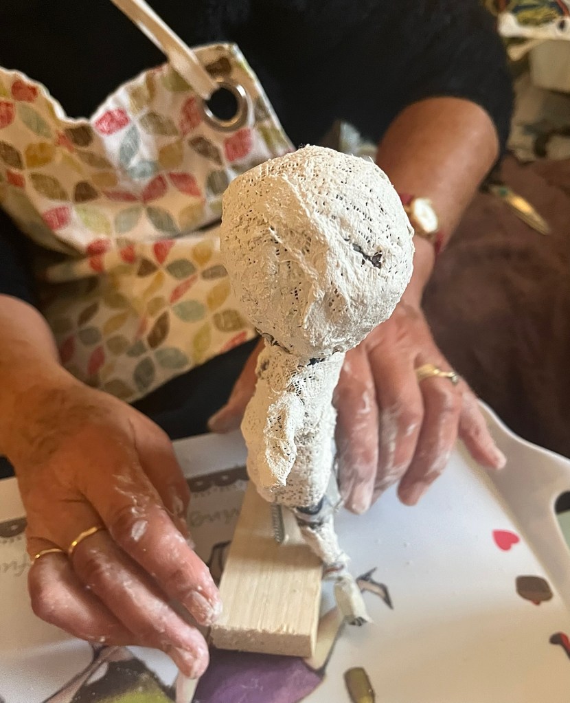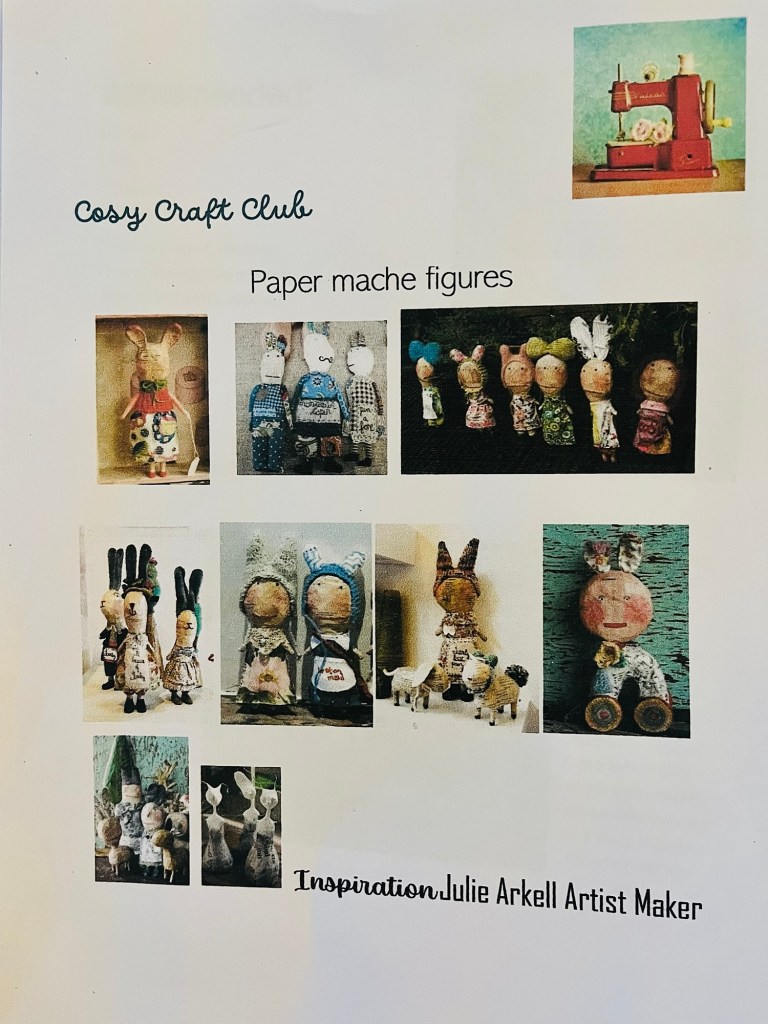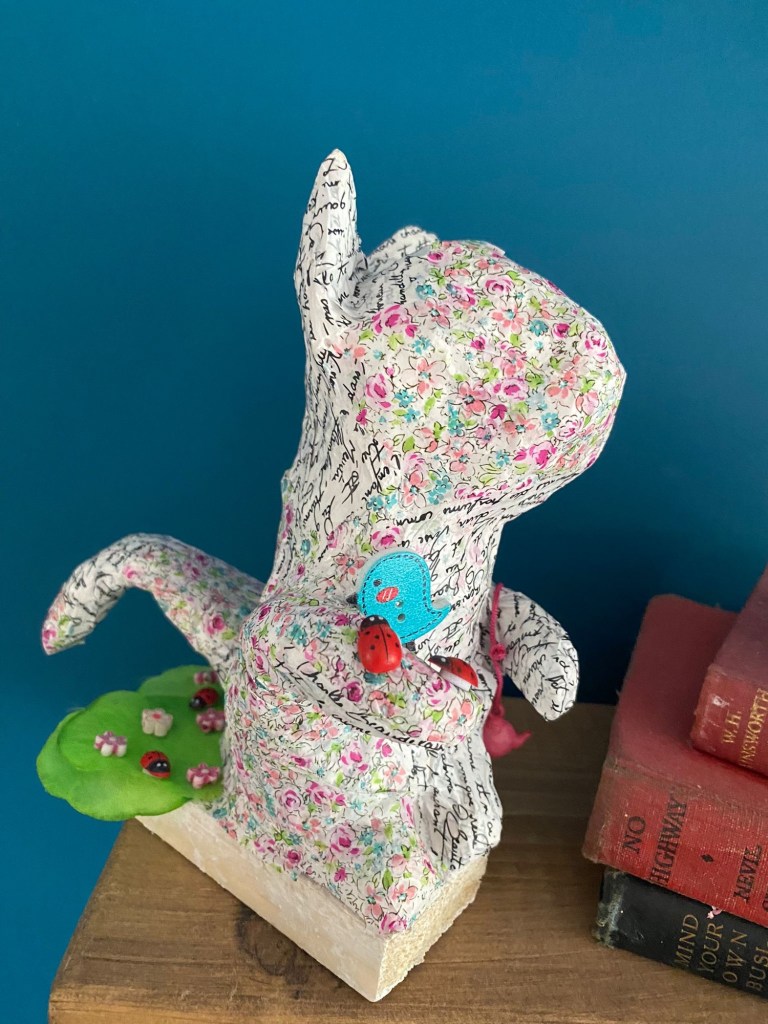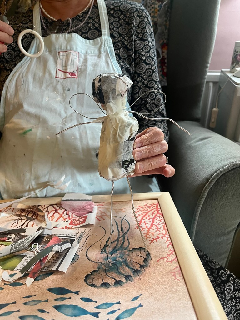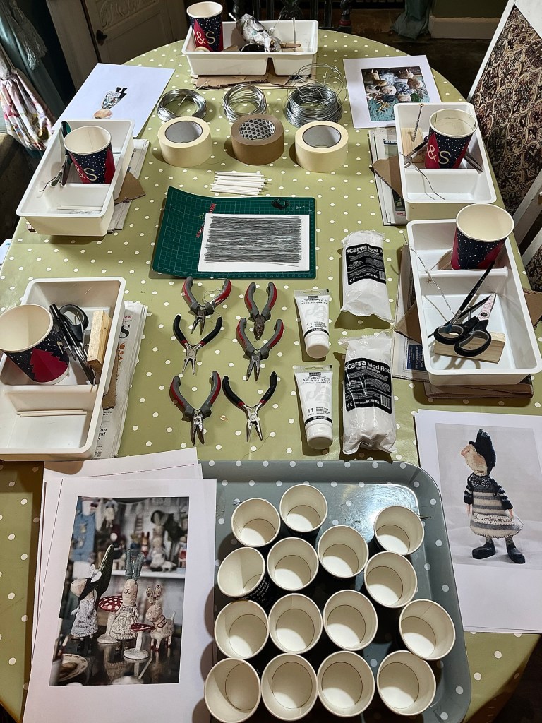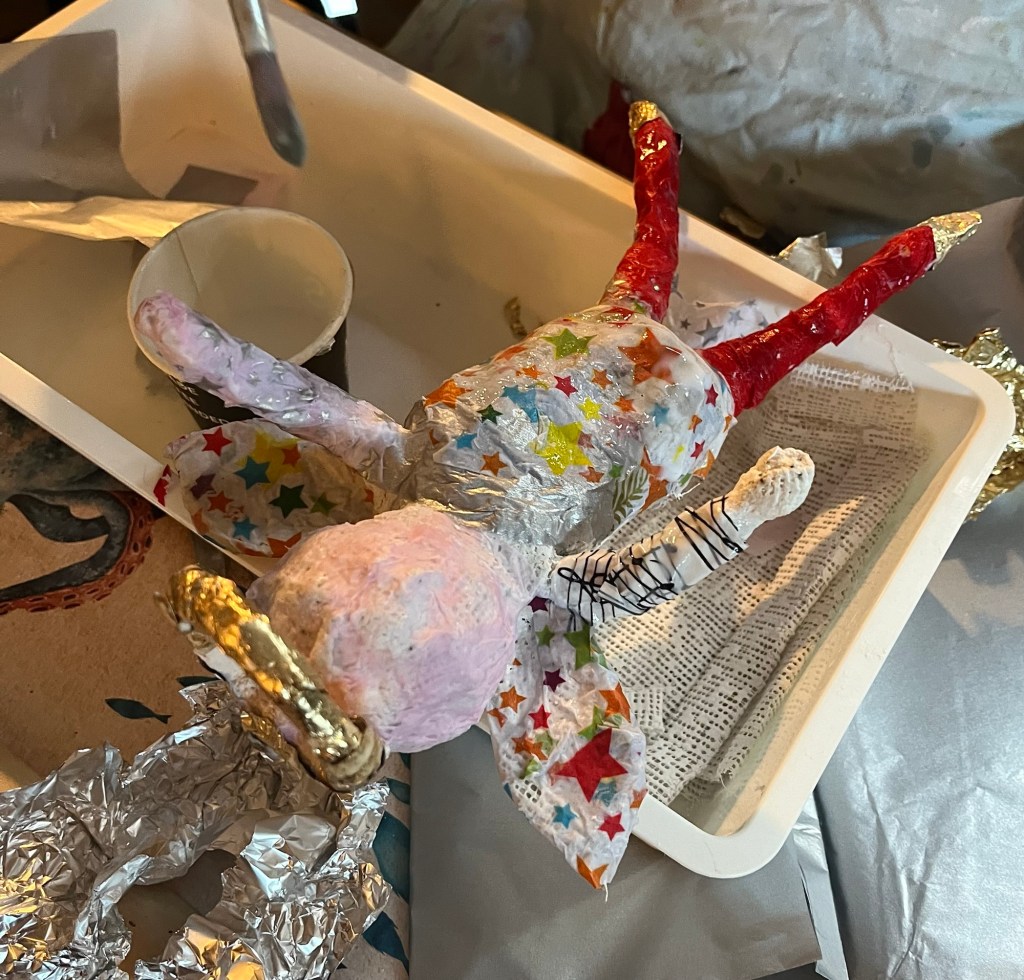 Our first project was a paper mache sculpture, inspired by Julie Arkell figures. Using a little wire maquette and newspaper, Modroc and then tissue paper and decoupage papers to decorate. With final touches of acrylic paint and tiny buttons etc.