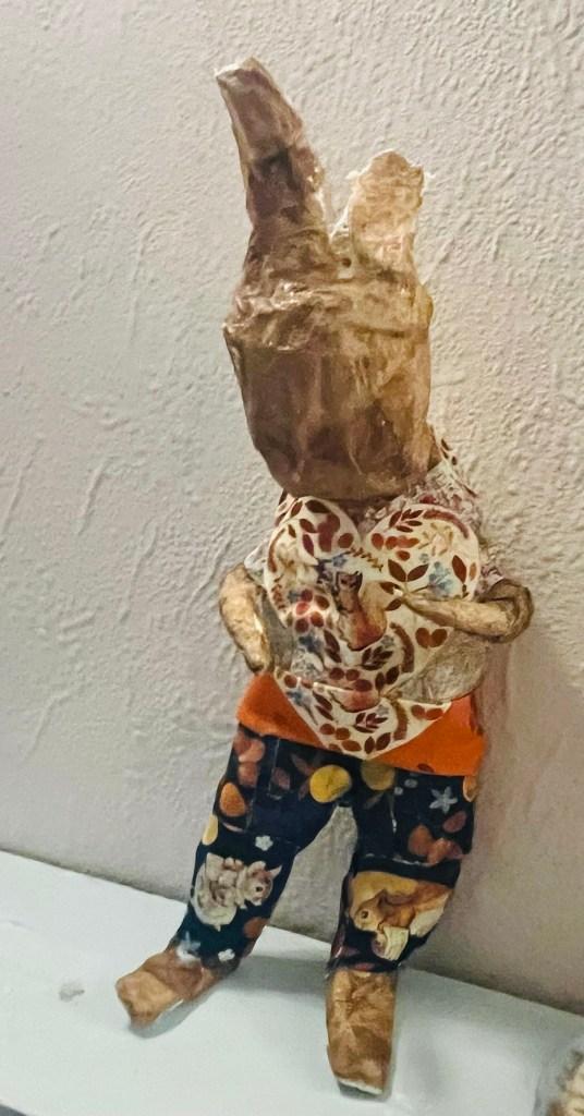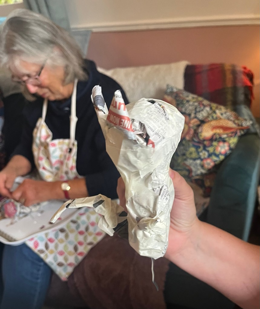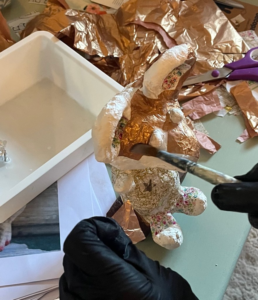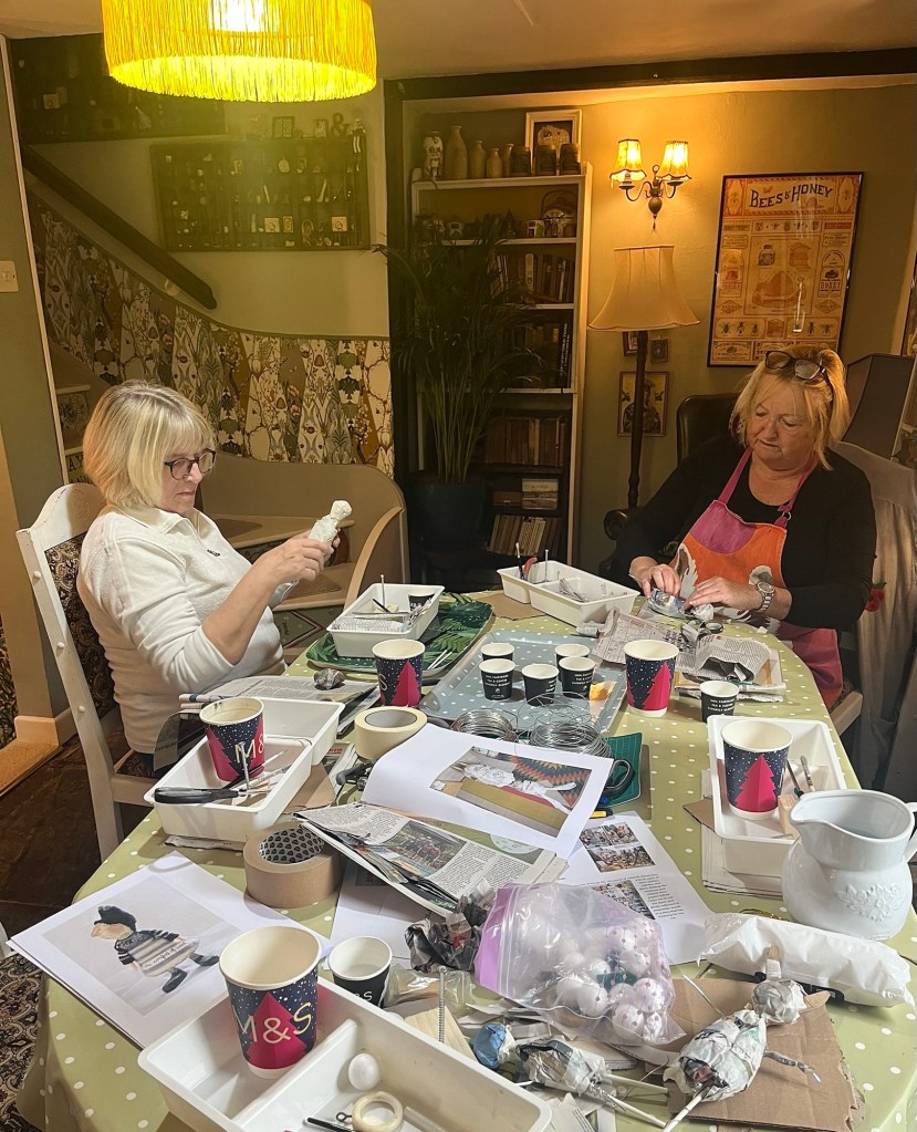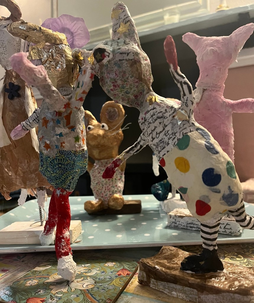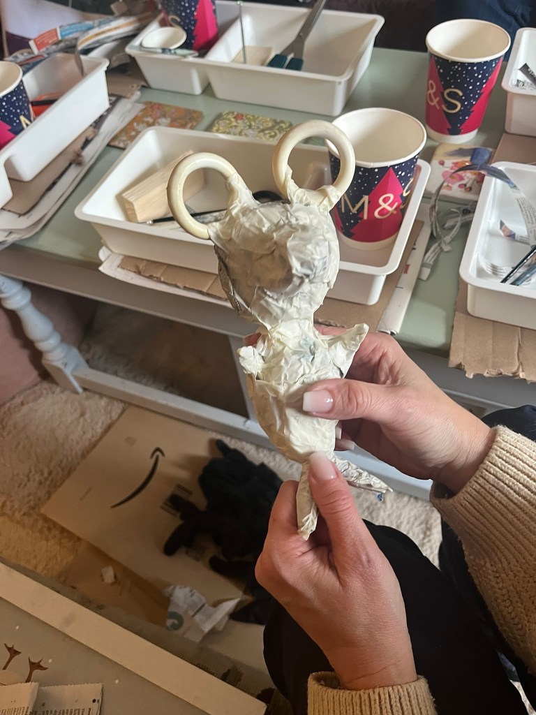 Our first project was a paper mache sculpture, inspired by Julie Arkell figures. Using a little wire maquette and newspaper, Modroc and then tissue paper and decoupage papers to decorate. With final touches of acrylic paint and tiny buttons etc.