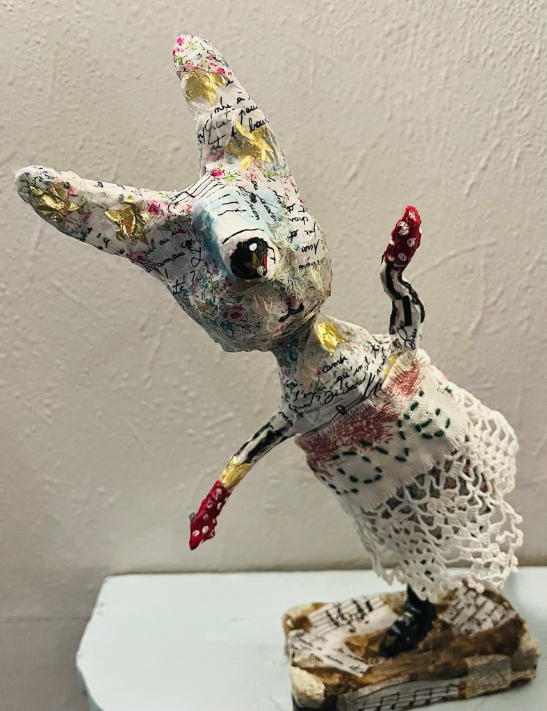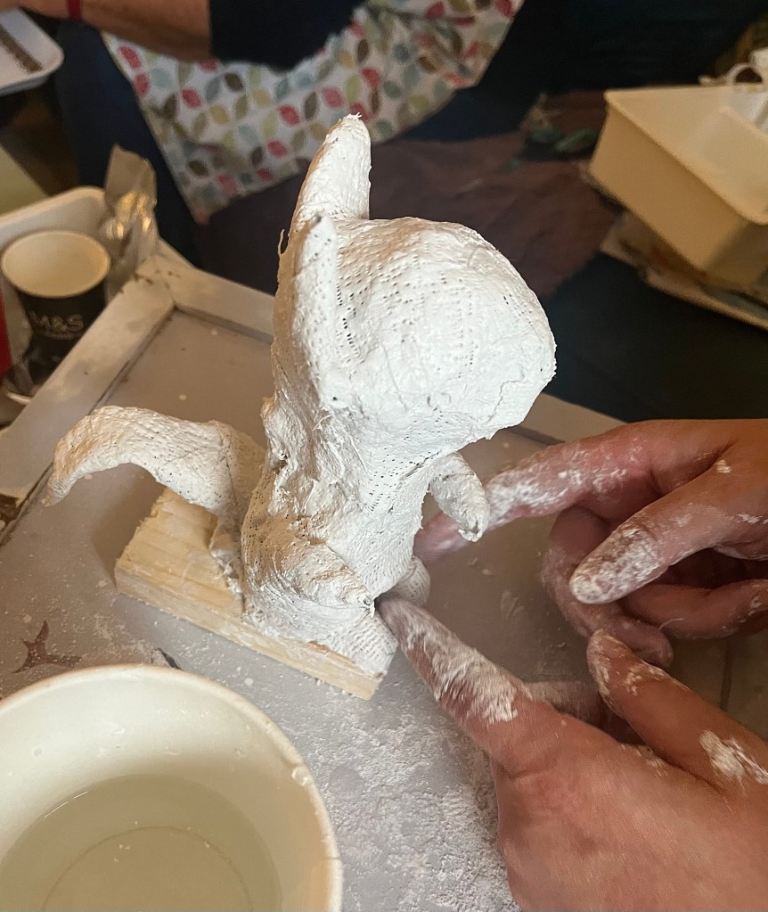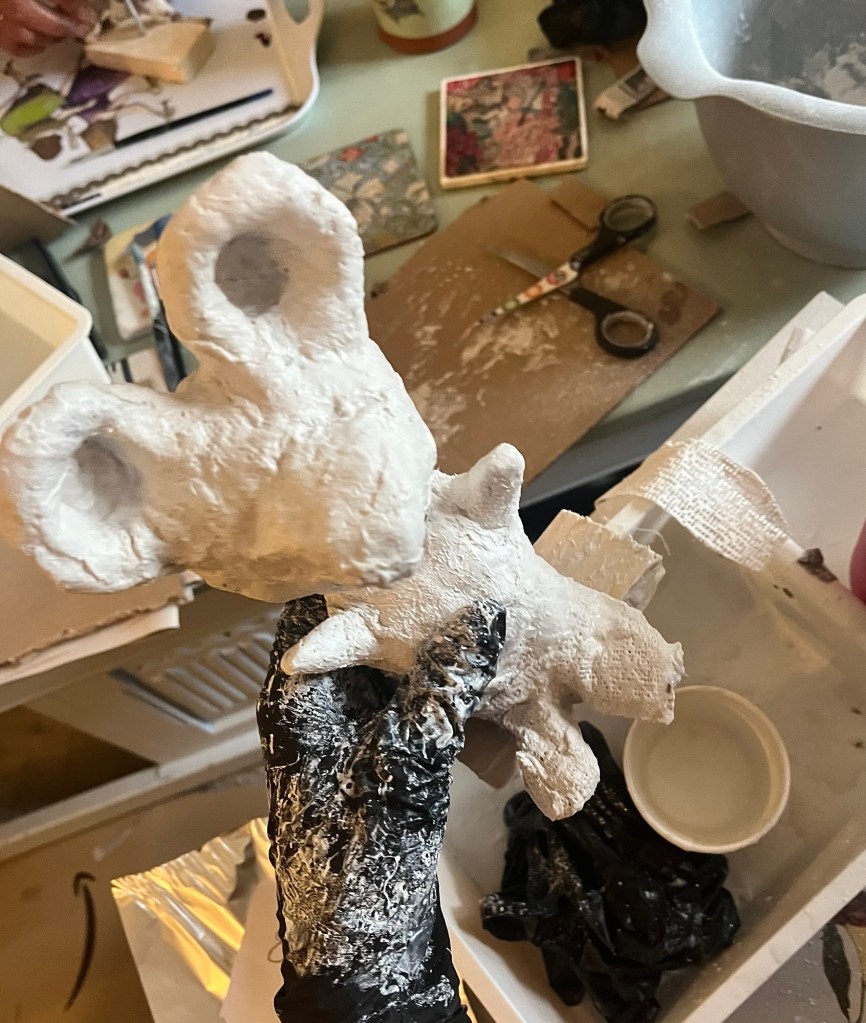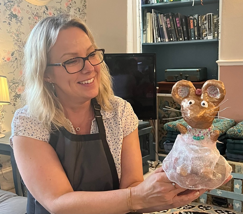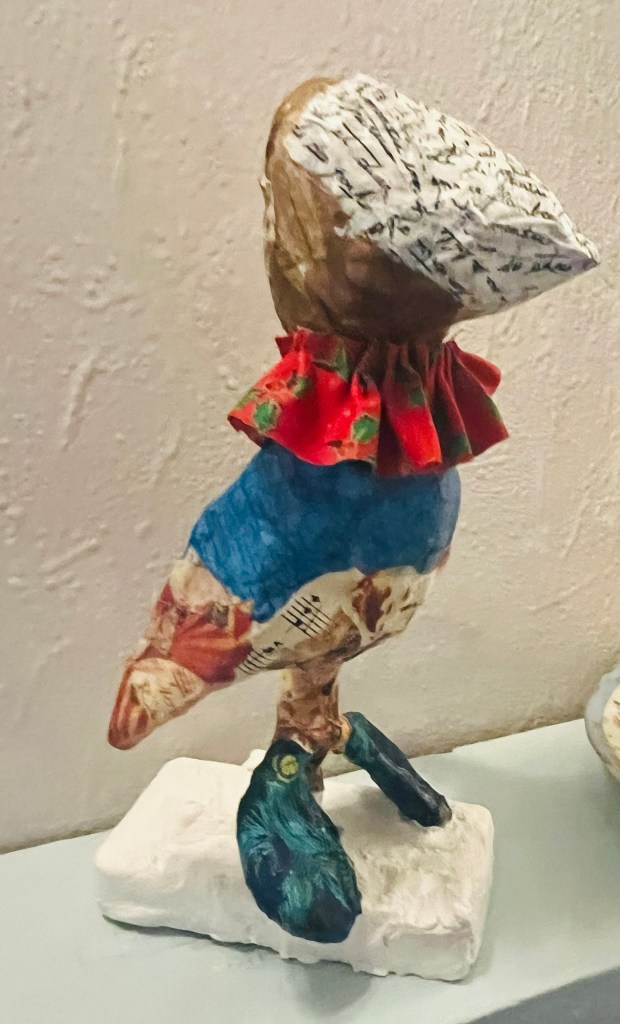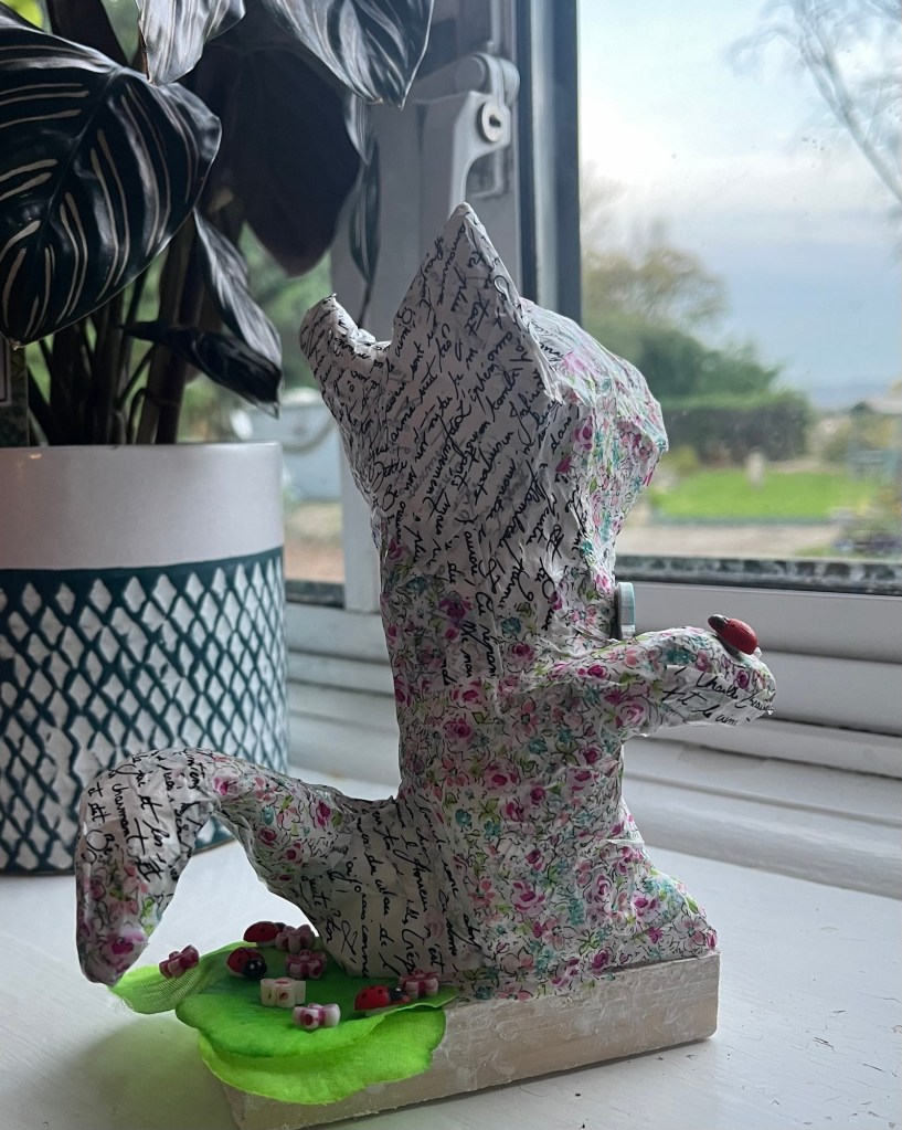 Our first project was a paper mache sculpture, inspired by Julie Arkell figures. Using a little wire maquette and newspaper, Modroc and then tissue paper and decoupage papers to decorate. With final touches of acrylic paint and tiny buttons etc.