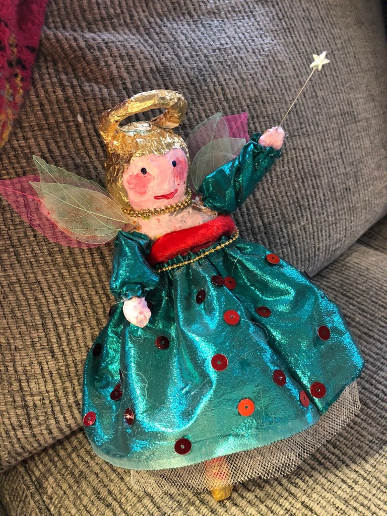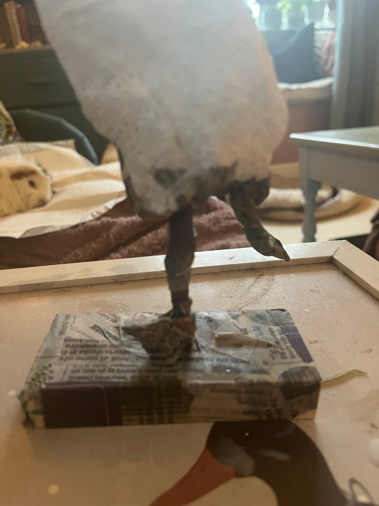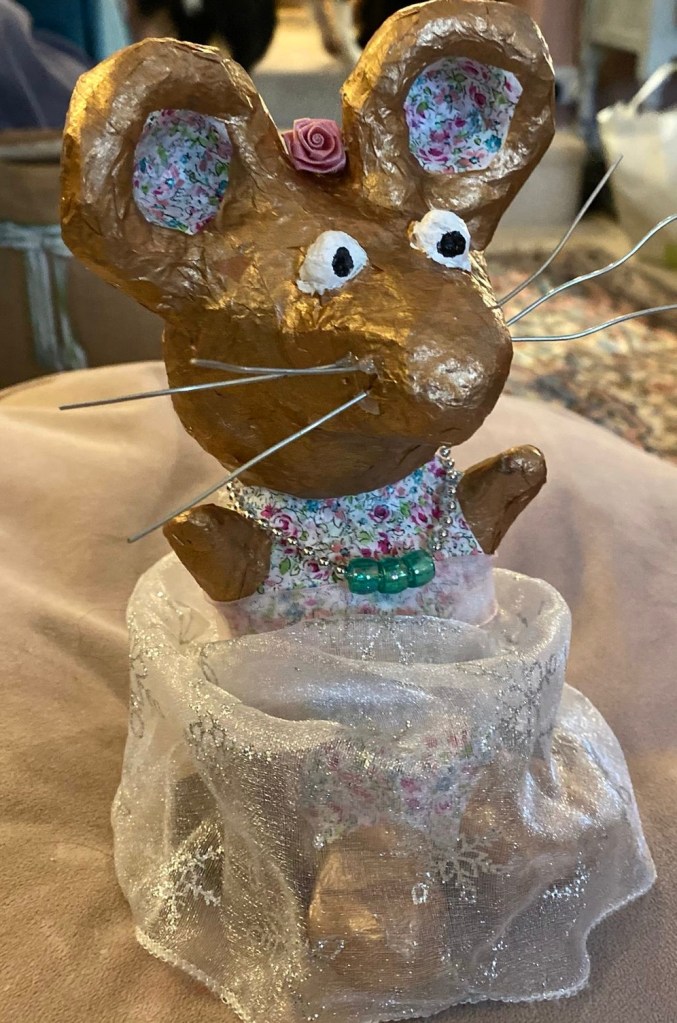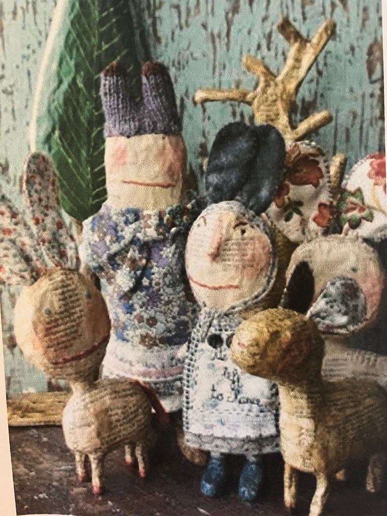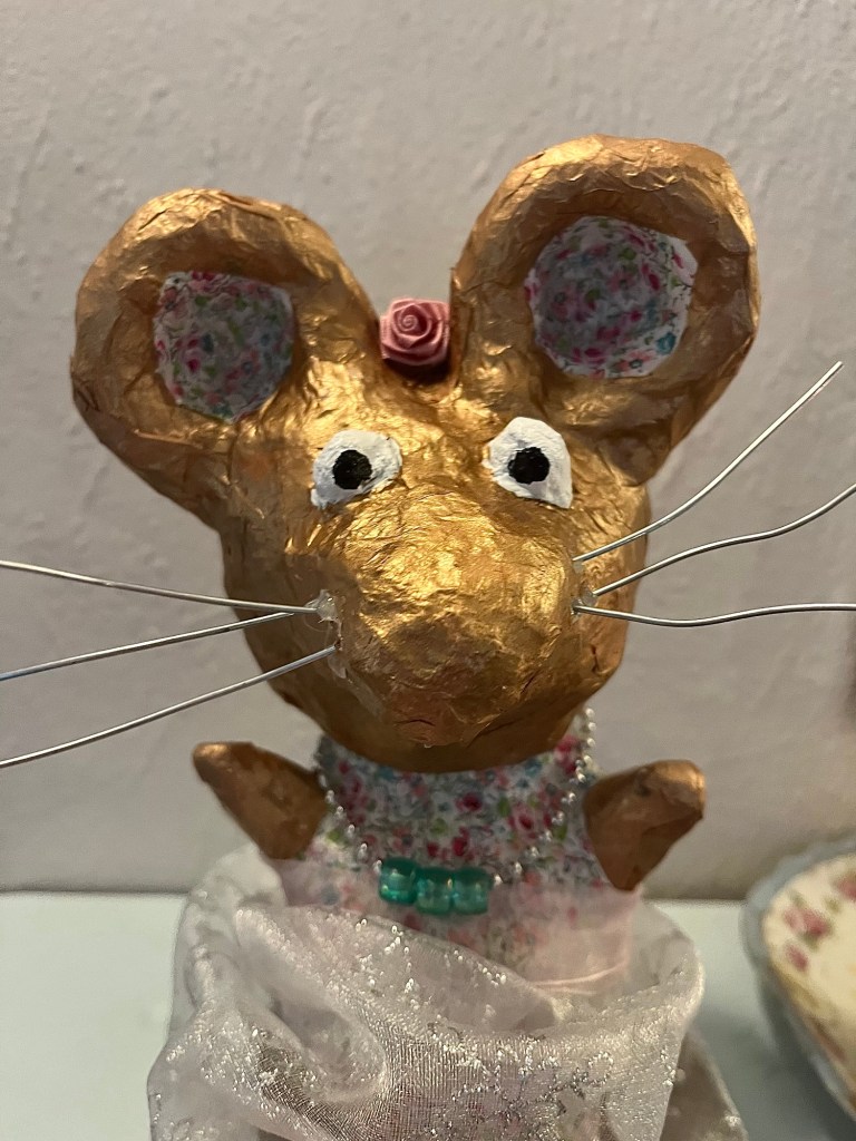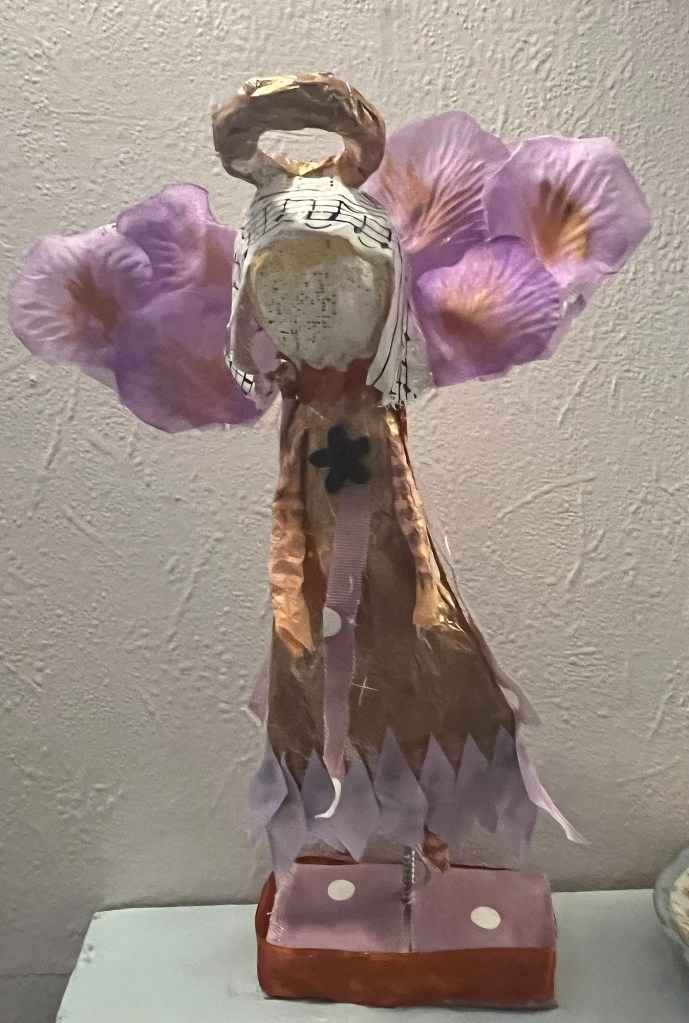 Our first project was a paper mache sculpture, inspired by Julie Arkell figures. Using a little wire maquette and newspaper, Modroc and then tissue paper and decoupage papers to decorate. With final touches of acrylic paint and tiny buttons etc.